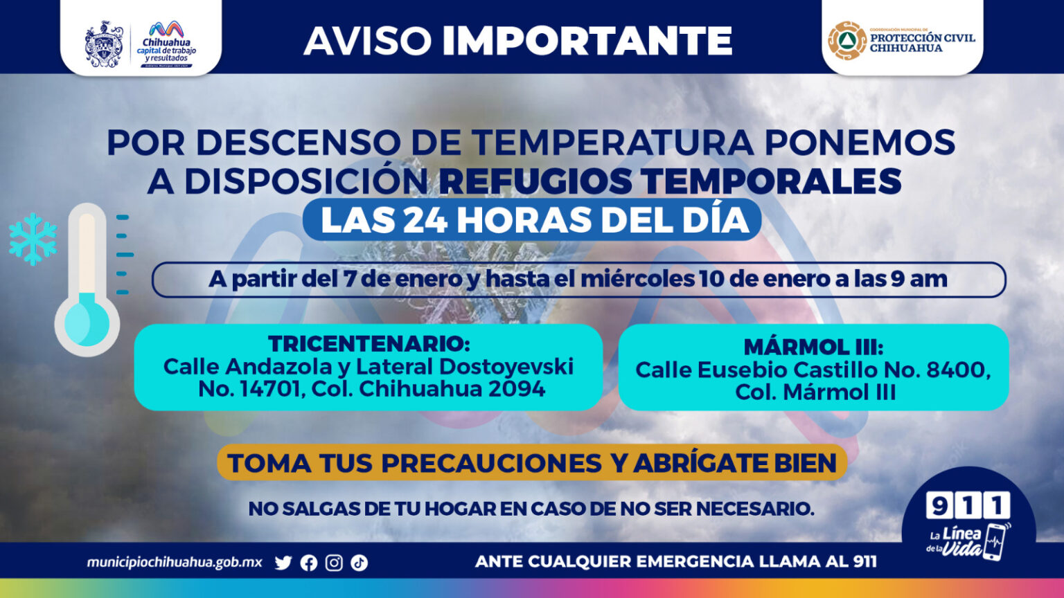 Los refugios temporales están ubicados en el centro comunitario Mármol III, en calle Eusebio Castillo número 8400 de la colonia Mármol lll en la zona sur; y en el centro comunitario Tricentenario, en calle lateral Dostoyevsky y calle Andazola numeral 14701 en colonia Chihuahua 2094 en la zona norte de la ciudad, donde se brinda alimentos y bebidas calientes a quienes acudan.