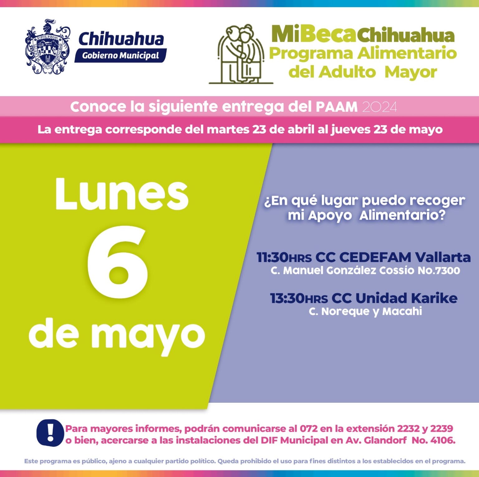 El Gobierno Municipal, a través del DIF, informa a las y los seleccionados del Programa Alimentario del Adulto Mayor (PAAM) que podrán acudir por su paquete alimentario este lunes 06 de mayo al CEDEFAM Vallarta, a las 11:30 horas y al centro comunitario Unidad Karike, a las 13:30 horas