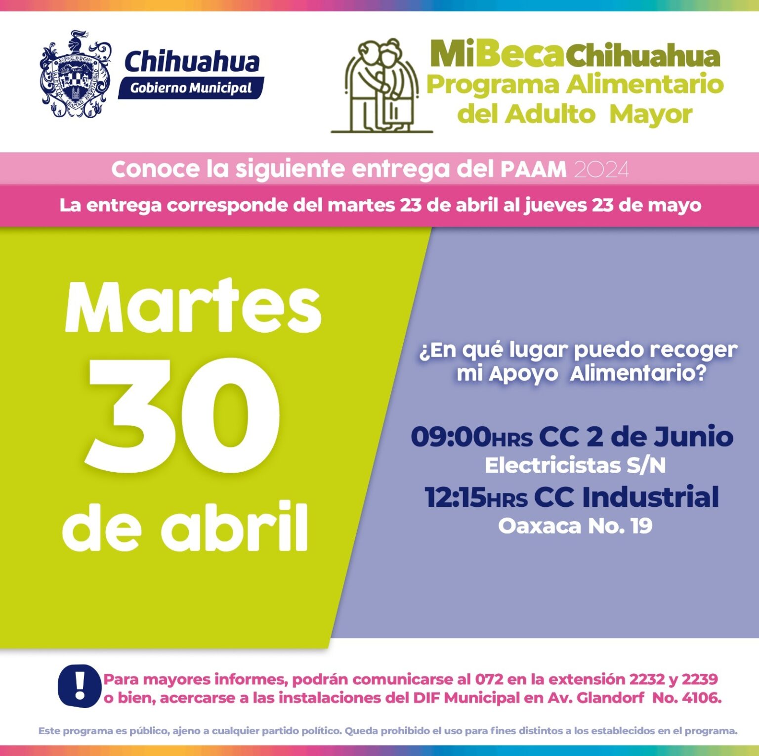 Chihuahua, Chih.- El Gobierno Municipal, a través del DIF, informa a las y los seleccionados del Programa Alimentario del Adulto Mayor (PAAM) que podrán acudir por su paquete alimentario este martes 30 de abril, en los centros comunitarios 2 de Junio, a las 9:00 horas y en el Industrial, a las 12:15 horas
