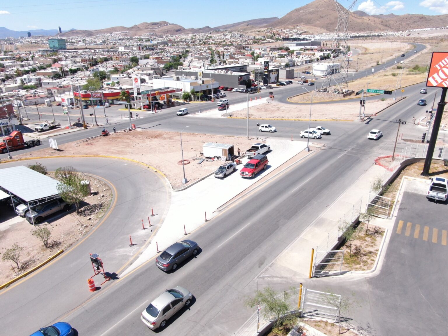 Los trabajos se realizan mediante la Dirección de Obras Públicas, y al momento se reporta un avance del 55 por ciento de las labores realizadas, restando la colocación de semáforos vuelta izquierda, afine de terreno en isletas, colado de concreto hidráulico en guarnición y banqueta, así como la colocación de bolardos que protegen el área peatonal del crucero.