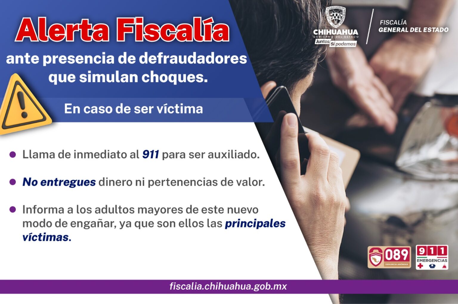 La Fiscalía de Distrito Zona Centro, hace un llamado a la ciudadanía y alerta sobre otra modalidad de engaño y estafa, principalmente contra adultos mayores, en donde sujetos aparentemente de otro país hacen creer a la víctima que les ha chocado su vehículo y lo presionan al grado de arrebatarle dinero y hasta propiedades para pagar el supuesto daño.