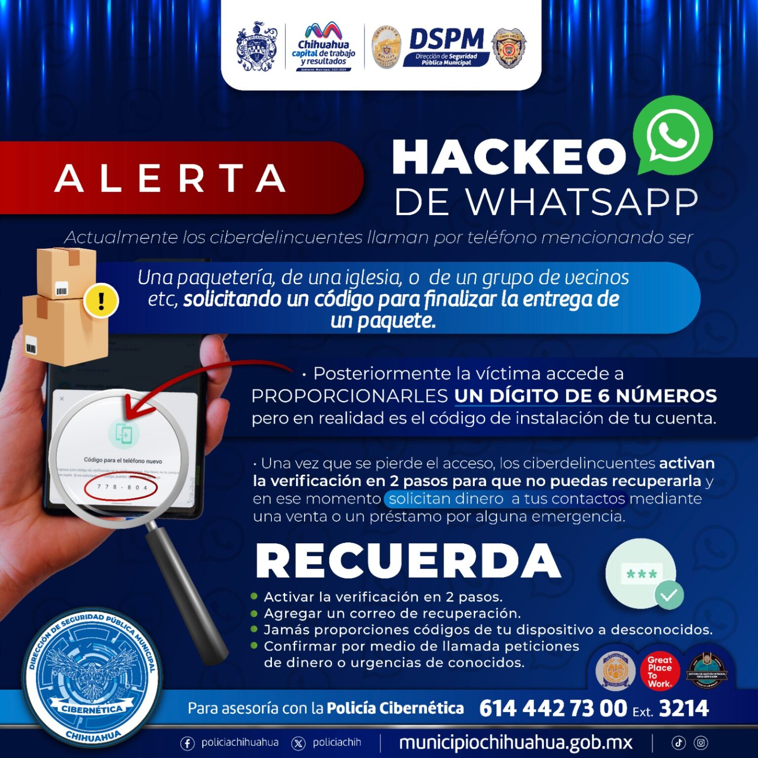 Der acuerdo con la Dirección de Seguridad Pública Municipal, en los últimos meses se reportó a la Policía Cibernética una nueva modalidad de hackeo por medio de la red social WhatsApp, por lo que el Gobierno Municipal alertó a la comunidad y emitió algunas recomendaciones con el fin de ayudar a evitar convertirse en víctimas de estos delincuentes.