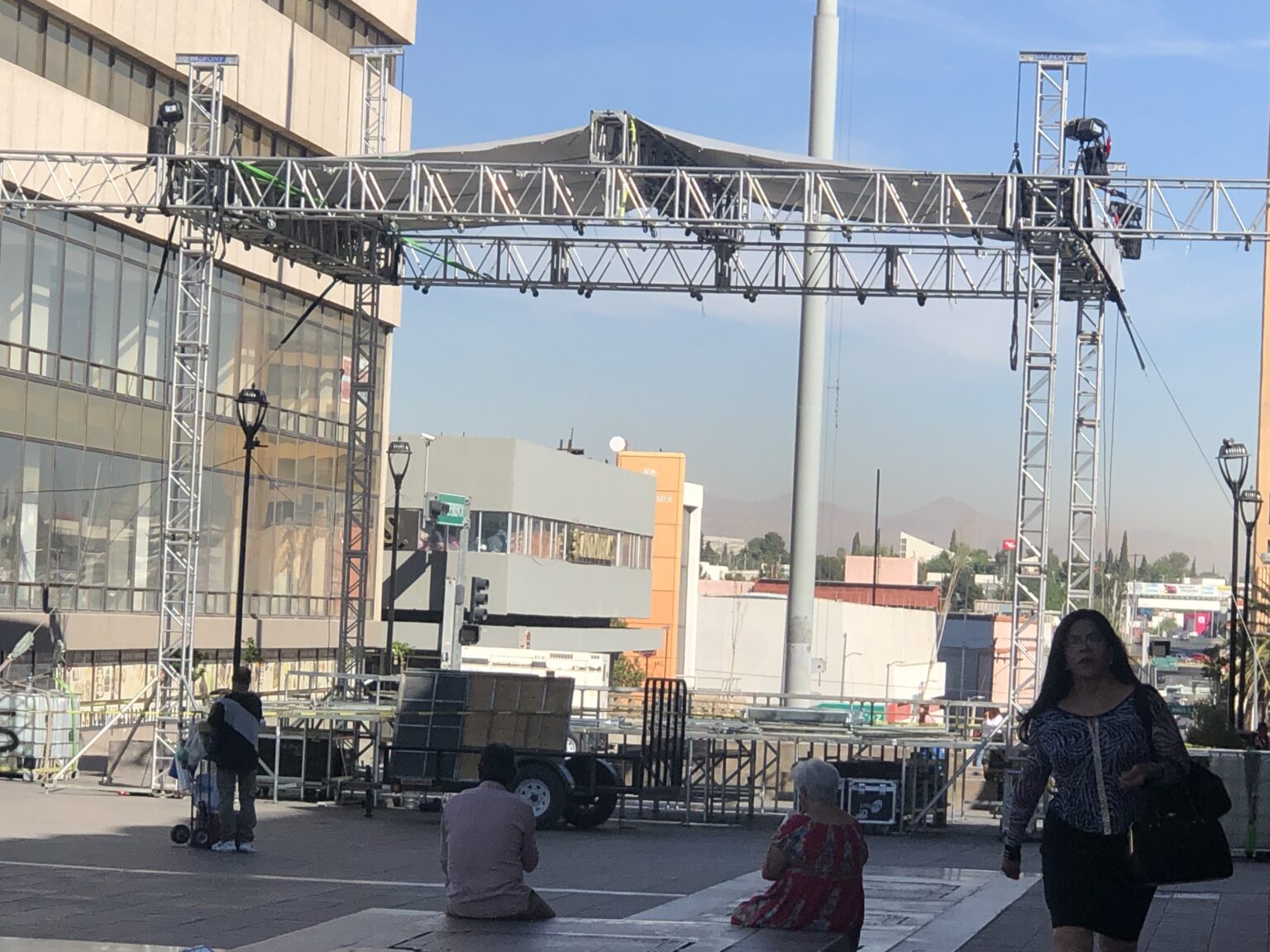 Chihuahua, Chih.- Esta mañana la Plaza de Armas del centro histórico de la ciudad amaneció con trabajadores montando un escenario, con aparentemente más del sesenta por ciento de avance, cuyo propósito será recibir mañana al alcalde con licencia, Marco Antonio Bonilla Mendoza, en calidad de candidato a la presidencia municipal en búsqueda de su segunda administración.
