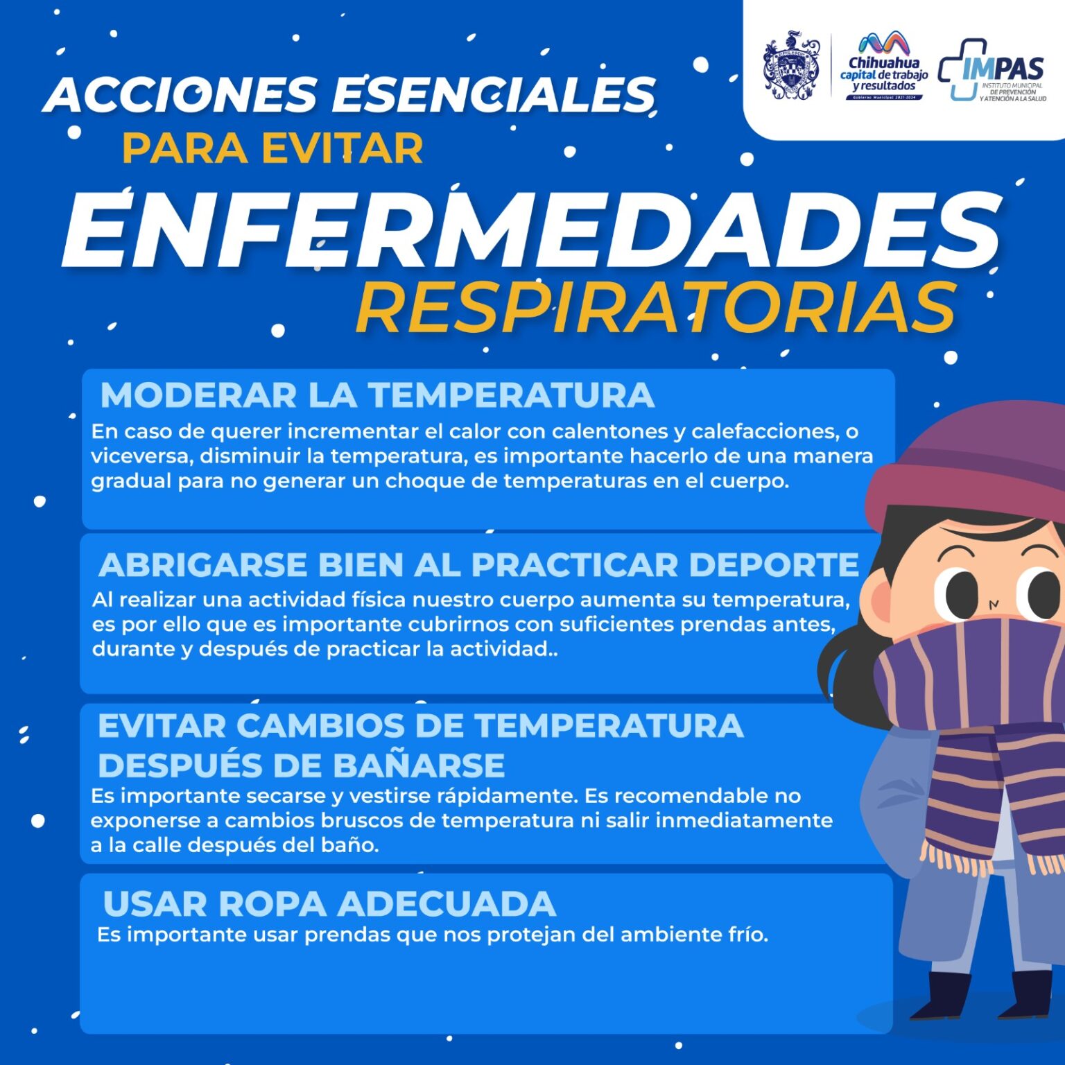 En atención a la visión del alcalde Marco Bonilla de cuidar la salud de las familias, el Gobierno Municipal, por medio del Instituto Municipal de Prevención y Atención a la Salud (IMPAS), emite recomendaciones para prevenir enfermedades respiratorias en esta temporada otoñal, debido a los cambios de temperatura que se pudieran presentar.