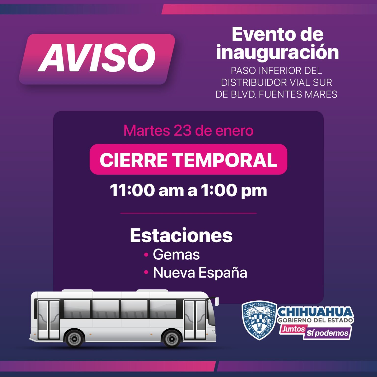 La Secretaría General de Gobierno, a través de la Operadora de Transporte (OTV), informó a los usuarios de Bowi que este martes 23 de enero, se cerrarán de forma temporal las estaciones Gemas y Nueva España, debido a la inauguración del Paso Inferior del Distribuidor Vial Sur.