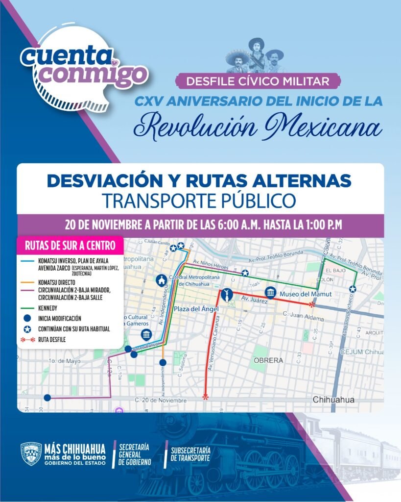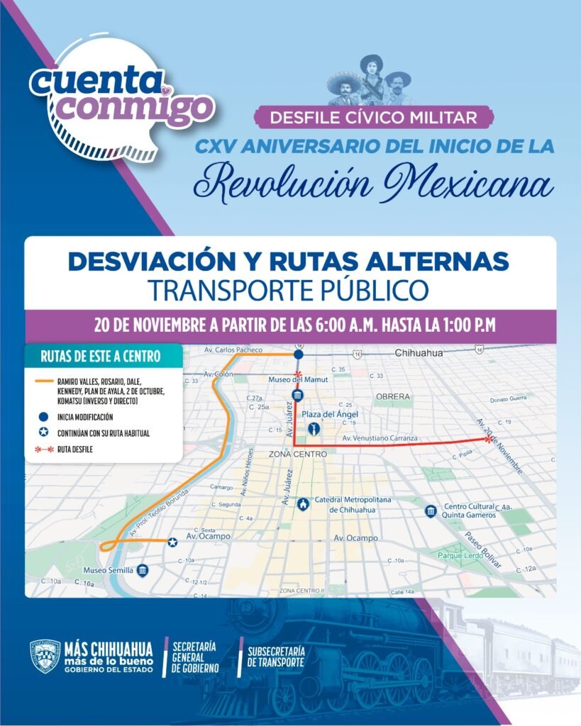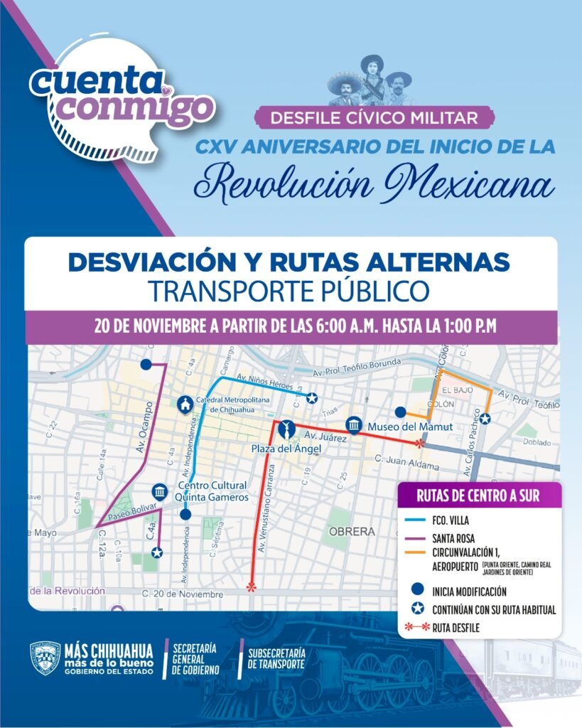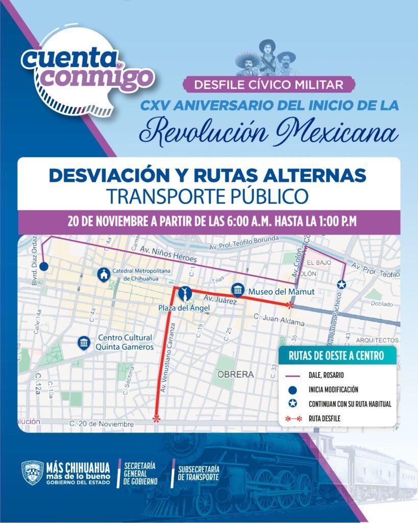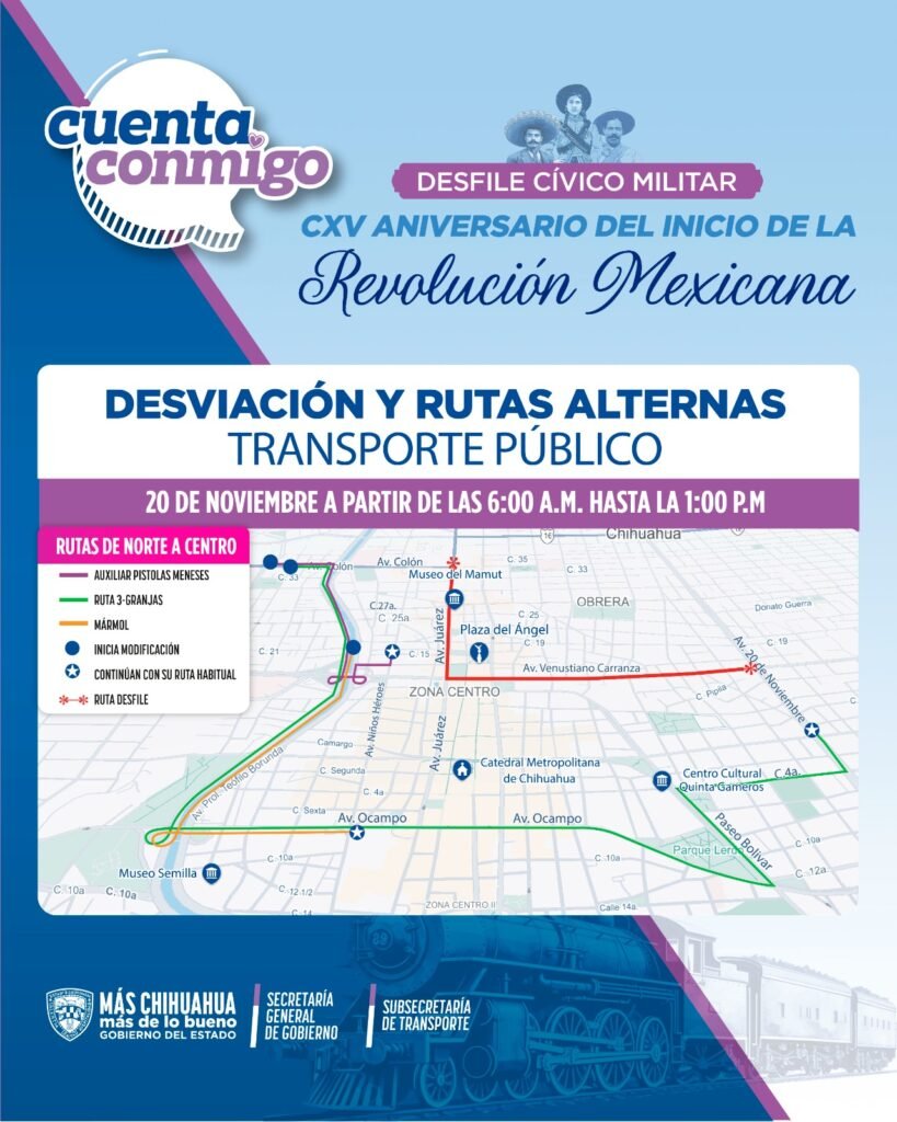 Con motivo del tradicional desfile cívico-militar del 20 de noviembre, serán cerradas las avenidas principales del primer cuadro de la ciudad, por las que circulan las unidades que brindan el servicio de Transporte Colectivo Urbano.