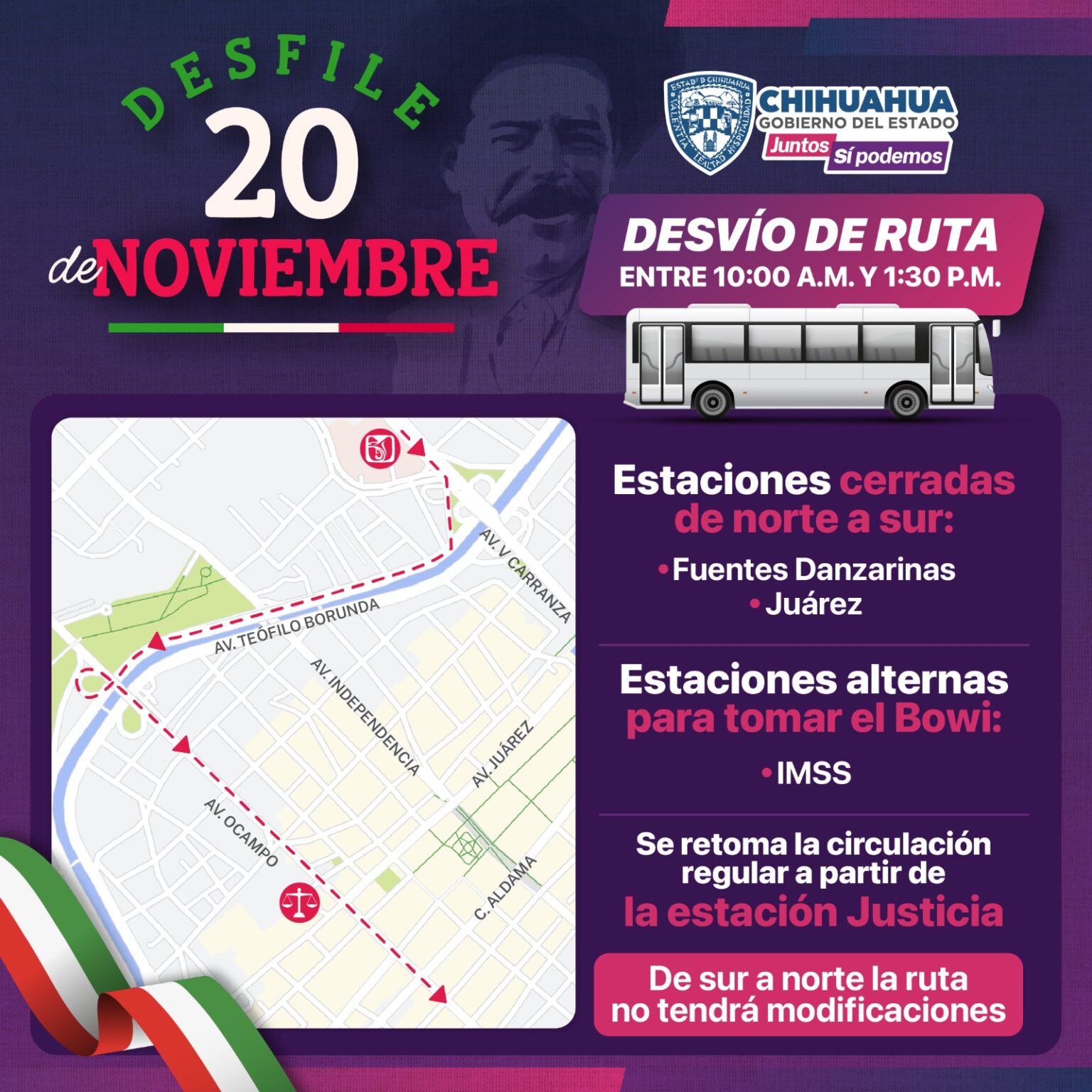 La Secretaría General de Gobierno, a través de la Subsecretaría de Transporte, da a conocer las modificaciones temporales en 11 rutas que transitan de las zonas sur y poniente hacia al centro, debido al tradicional desfile en conmemoración del 113 Aniversario del Inicio de la Revolución Mexicana.