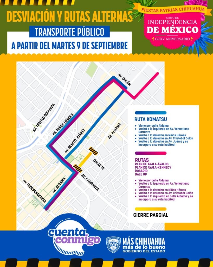 La Secretaría General de Gobierno dio a conocer que, a partir del día de hoy estará cerrada parcialmente la avenida Aldama en Chihuahua capital, con motivo de la instalación del escenario para los tradicionales festejos patrios, por lo que se modificarán las rutas del servicio de Transporte y Colectivo Urbano.