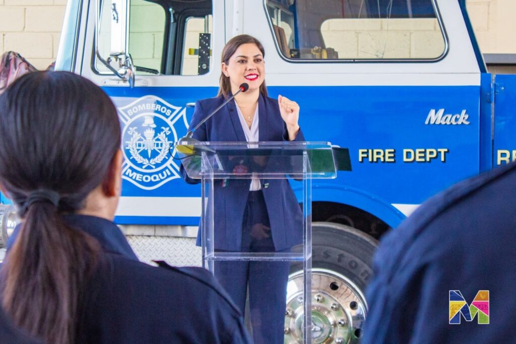 “Cuando protegemos a quienes nos protegen, protegemos a todo Meoqui”, expresó la alcaldesa, quien además agradeció al comandante José Manuel Domínguez, enlace con el Departamento de Bomberos de El Paso, Texas, por la donación de 14 chaquetas, 24 pantalones, 3 cascos, 4 pares de tirantes y 6 pares de botas. Destacó que este equipo es de gran importancia para la corporación, subrayando que cada casco representa protección, cada chaqueta preparación y cada par de botas la firmeza con la que los elementos atienden cada emergencia.