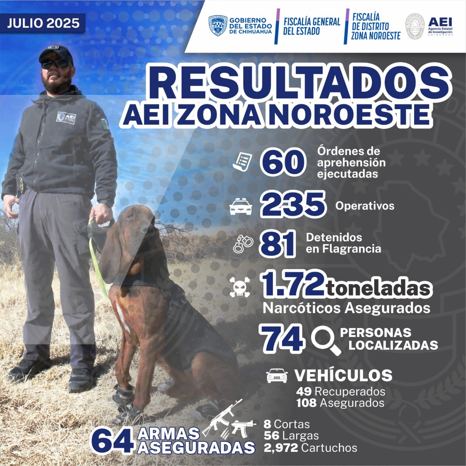 De igual manera, de enero a julio de 2025, la AEI ejecutó 60 órdenes de aprensión, y detuvo a 81 personas en flagrancia de algún delito.