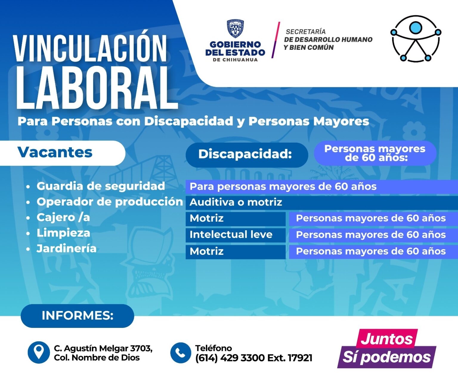 Diariamente se abren nuevas opciones de trabajo para ambos sectores de la población, por lo que invitó a las y los interesados a comunicarse para mayor información o dudas al teléfono (614) 429-33-00 extensión 17321.