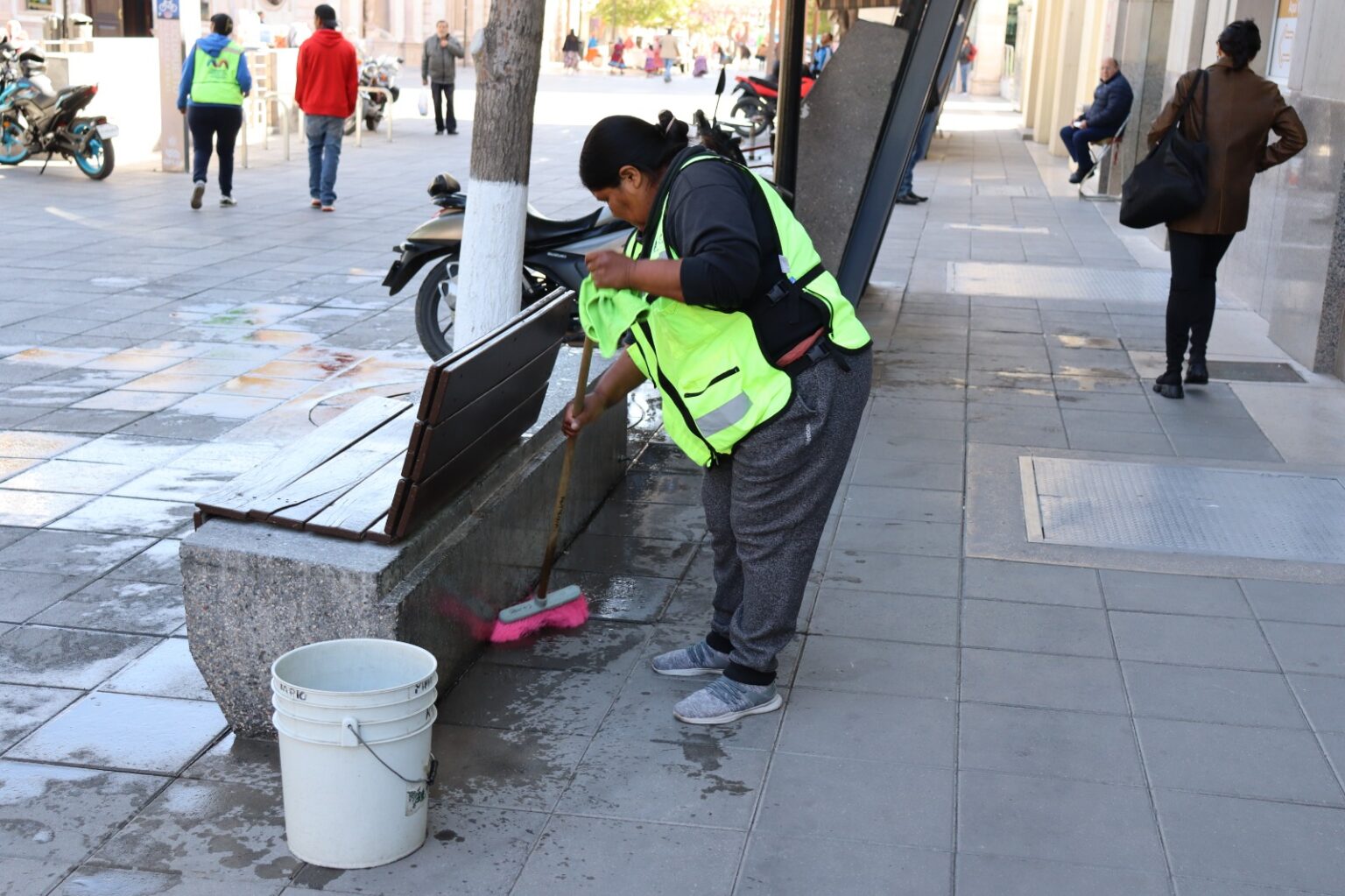 Los trabajadores desde las 7:00 am inician con labores como barrido, papeleo manual, limpieza de poco más de 2 mil 500 metros cuadrados de mármol, 56 alcorques, se limpian 181 bancas, riego, limpieza de suelos y paredes con hidro lavadora y cuando es necesario, poda, pintura y fumigación.