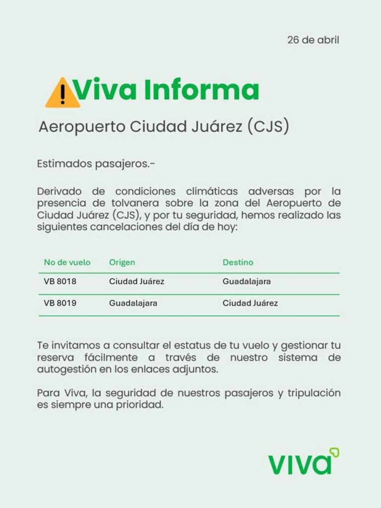 Este domingo la aerolínea Viva Aerobus informó la cancelación de varios vuelos en el Aeropuerto Internacional de Ciudad Juárez como medida preventiva, debido a las malas condiciones climáticas y la presencia de tolvaneras que reducen drásticamente la visibilidad.