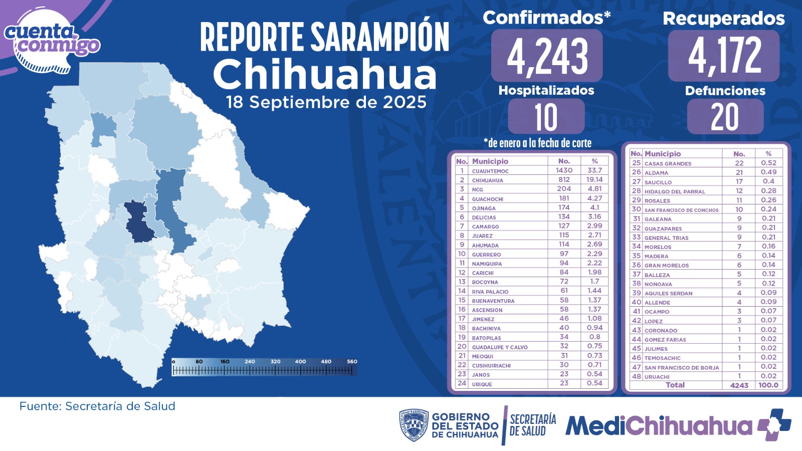 Reportó además el deceso, por complicaciones de Sarampión, de una menor de la etnia rarámuri de 4 años de edad, originaria del municipio de Cuauhtémoc, la defunción se registró el pasado 9 de septiembre en la ciudad de Chihuahua. Ambos menores no contaban con vacunas.