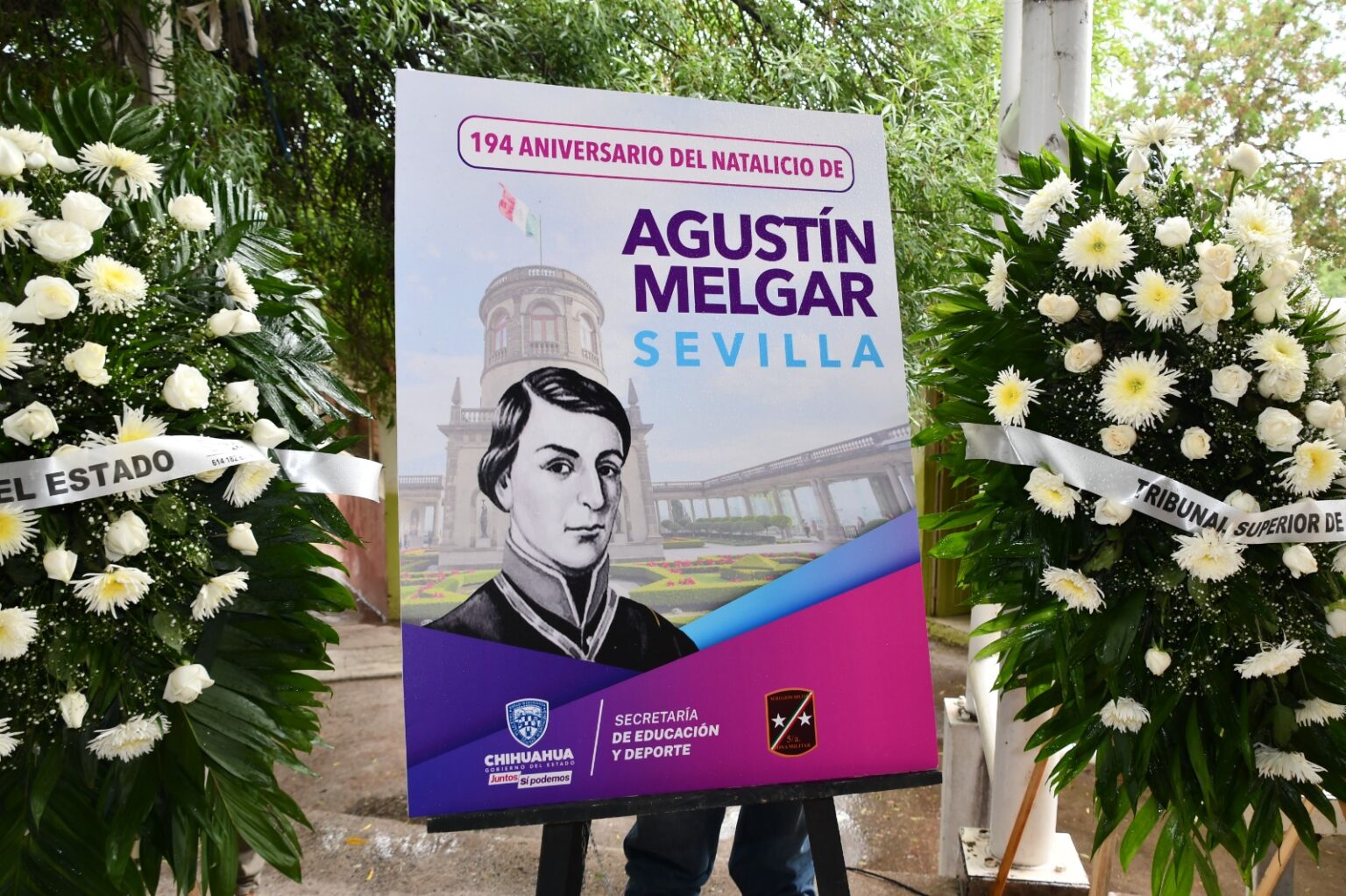 En el evento también se tuvo una reseña histórica por parte de la directora del plantel, Alicia Corrales Rugelio, quien señaló que su nombre completo era Agustín María José Francisco de Jesús de los Ángeles Melgar Sevilla, quien nació en la ciudad de Chihuahua en el año de 1829.