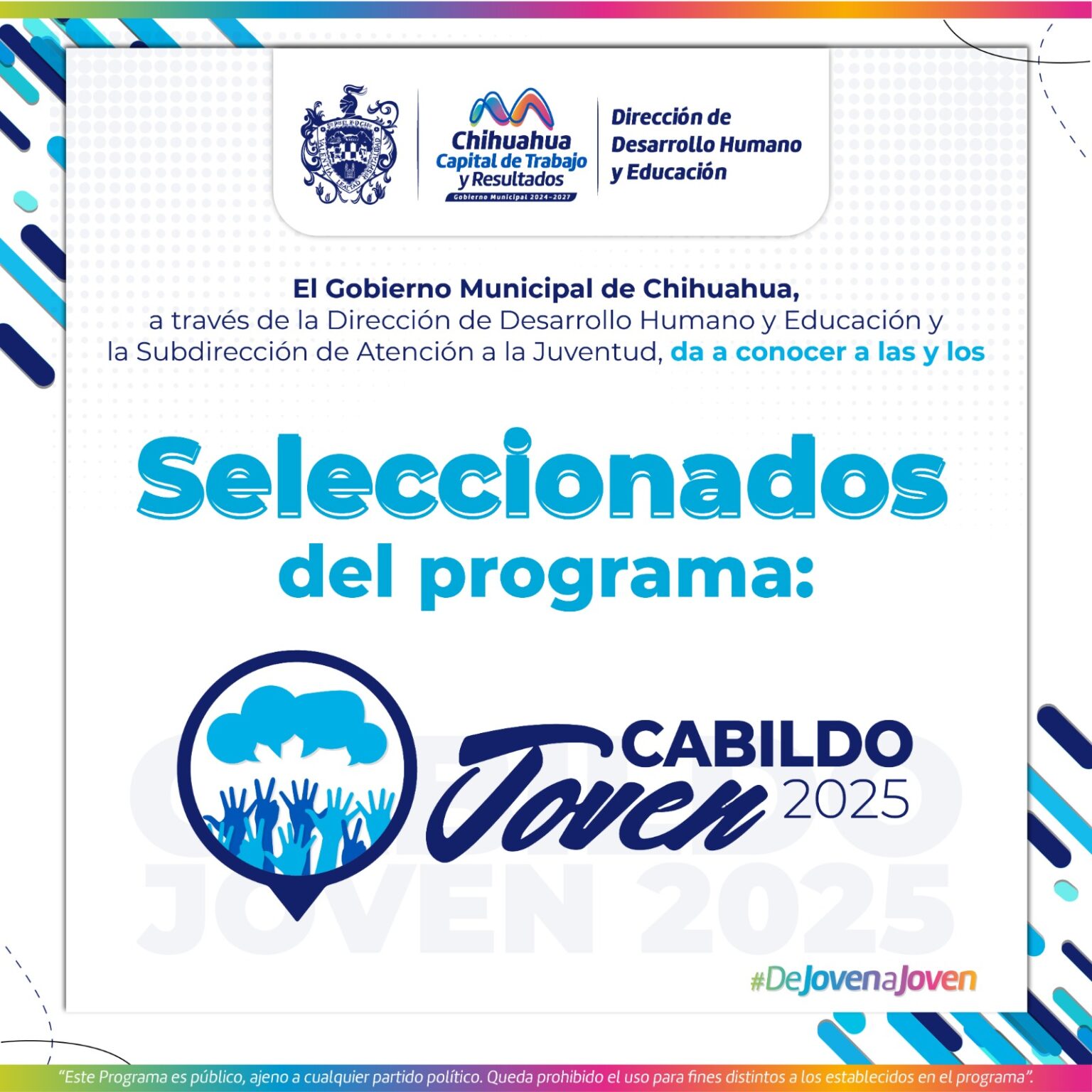 El Gobierno Municipal de Chihuahua, a través de la Dirección de Desarrollo Humano y Educación y su Subdirección de Atención a la Juventud, dio a conocer a los ganadores para participar en Cabildo Joven en su edición 2025.