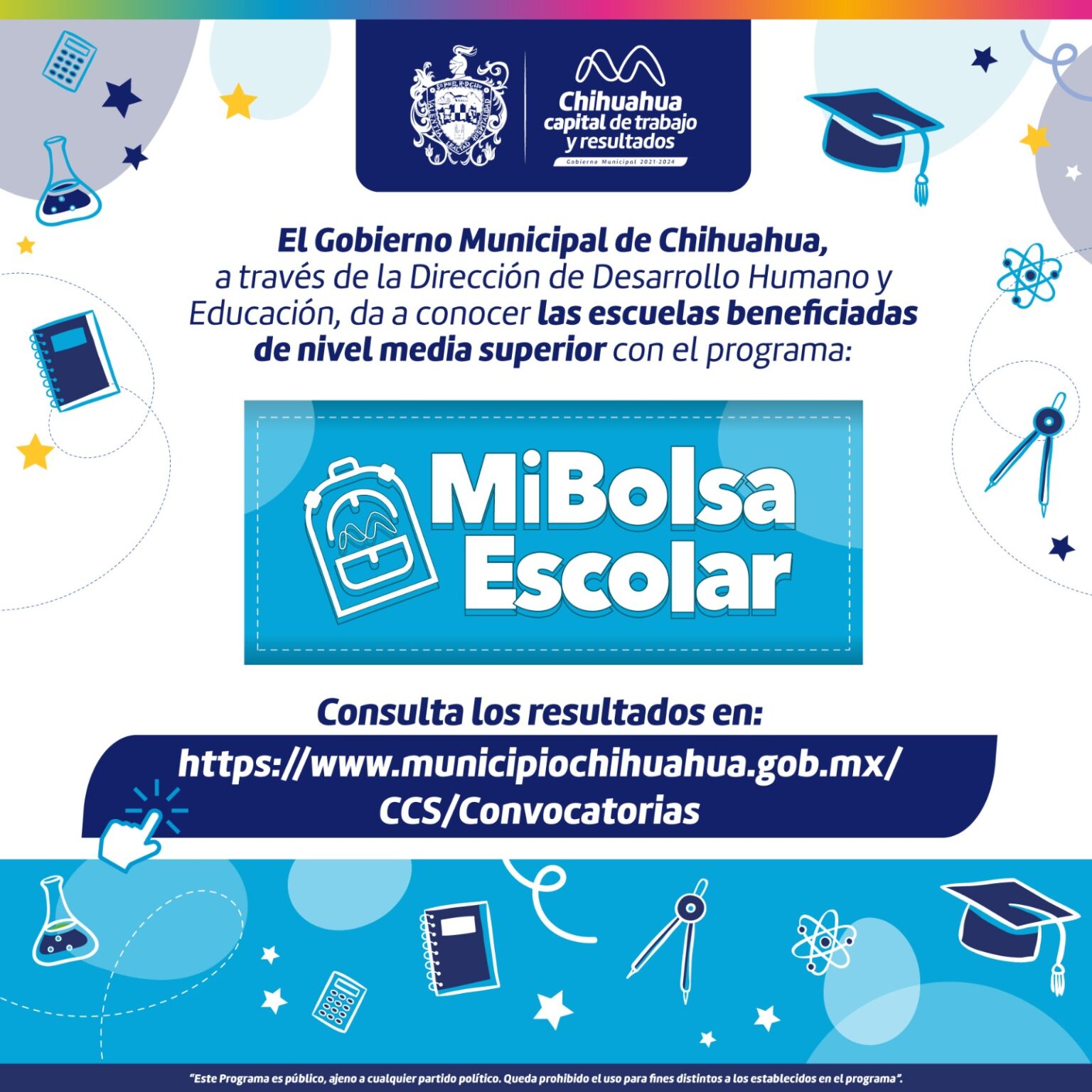Con el objetivo de contribuir a la economía de las familias del municipio de Chihuahua el Gobierno Municipal de Chihuahua a través de la Dirección de Desarrollo Humano y Educación da a conocer las escuelas públicas que serán beneficiadas con el programa “Mi Bolsa Escolar Chihuahua”.