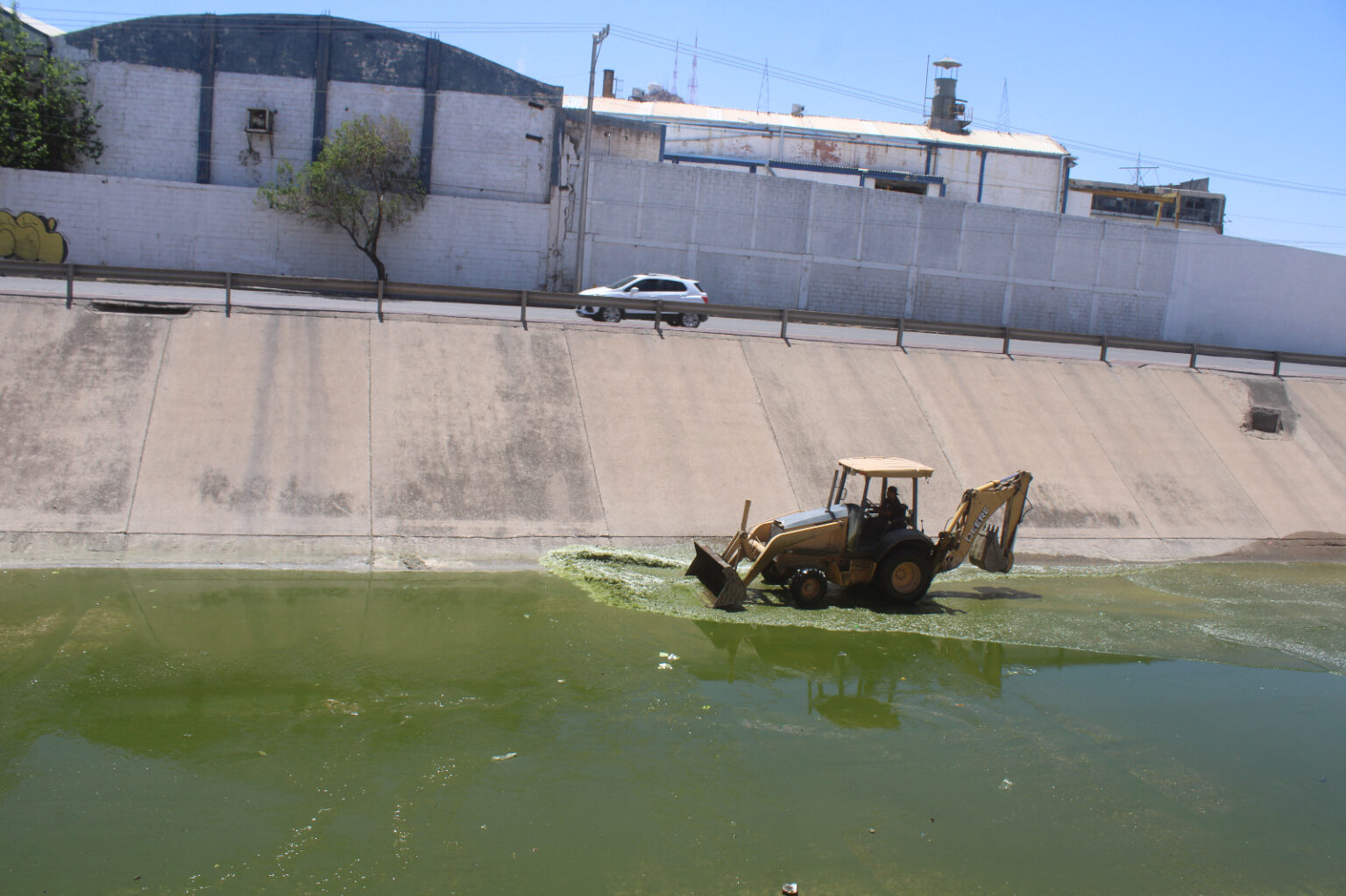 Con maquinaria pesada, se realizan los trabajos de limpieza en la parte canalizada del río Chuviscar mismas que se encargan de raspar la superficie para evitar la acumulación de lama y basura.