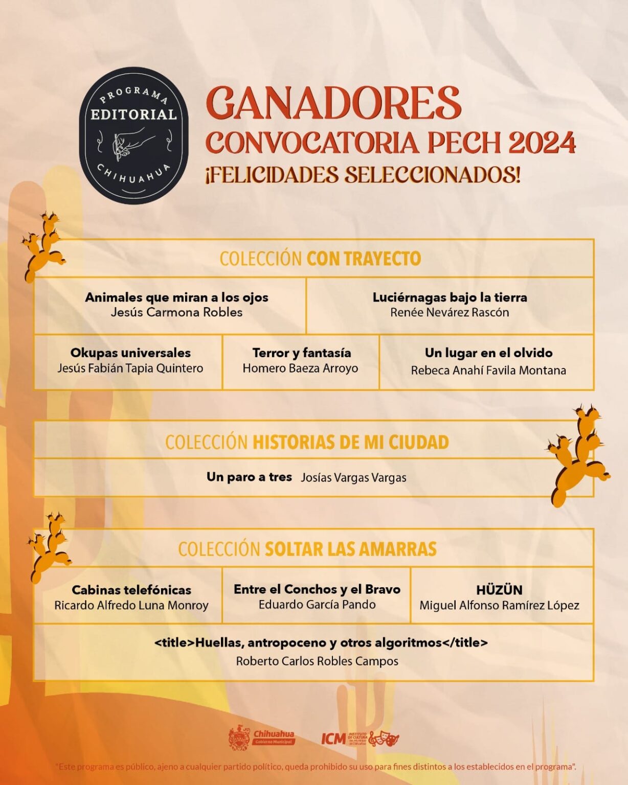 El PECH felicita a todos los escritores cuyas obras han sido seleccionadas para formar parte del ciclo 2024. Su talento, dedicación y pasión por la escritura son un verdadero tesoro para la comunidad literaria de Chihuahua.