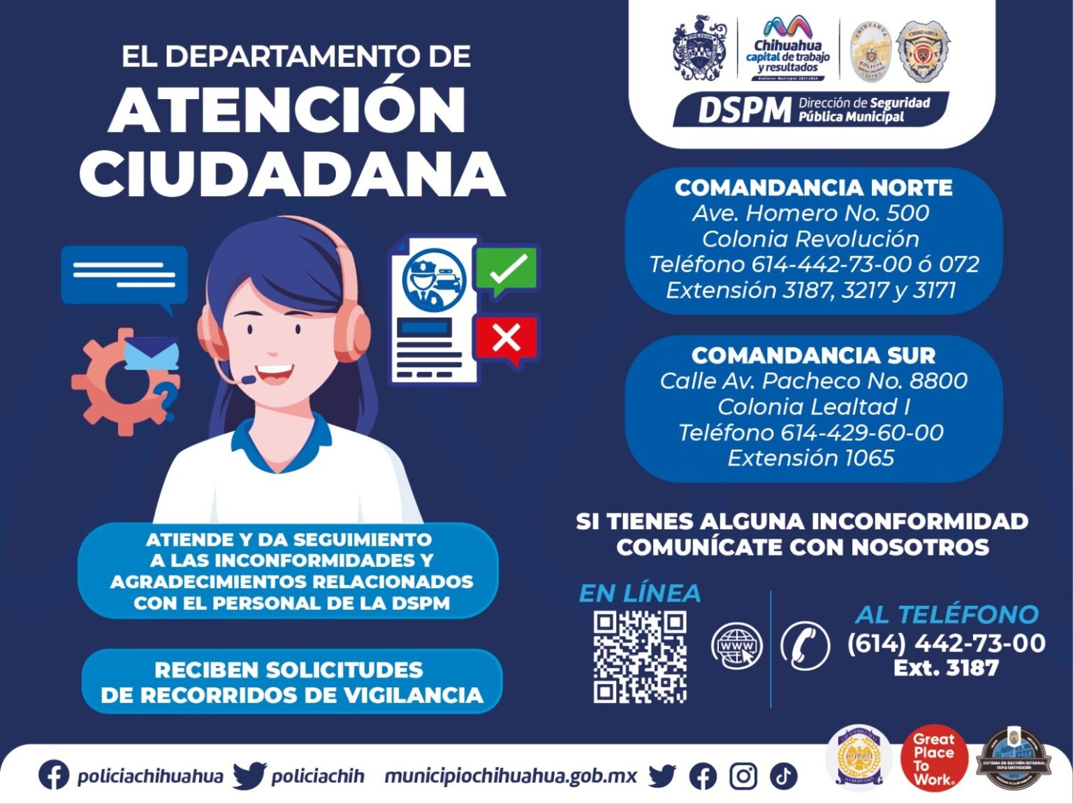 Para que los chihuahuenses puedan expresar inconformidades, felicitaciones o agradecimientos hacia los elementos de policía o bomberos, la Dirección de Seguridad Pública Municipal (DSPM), a través del departamento de Atención Ciudadana, creó un código QR y enlace, que serán utilizados para escuchar a la ciudadanía a fin y de castigar o premiar a los elementos.