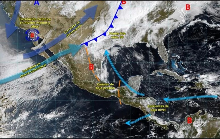 El frente frío 39 se desplazará sobre el norte y noreste del país e interactuará con un canal de baja presión y aire húmedo proveniente del Golfo de México. Esta combinación favorecerá lluvias fuertes, tormentas eléctricas y granizadas en varias entidades del norte, mientras que en la península de Baja California una circulación ciclónica en niveles altos de la atmósfera provocará vientos intensos y lluvias aisladas, con posible nieve o aguanieve en la sierra de San Pedro Mártir.