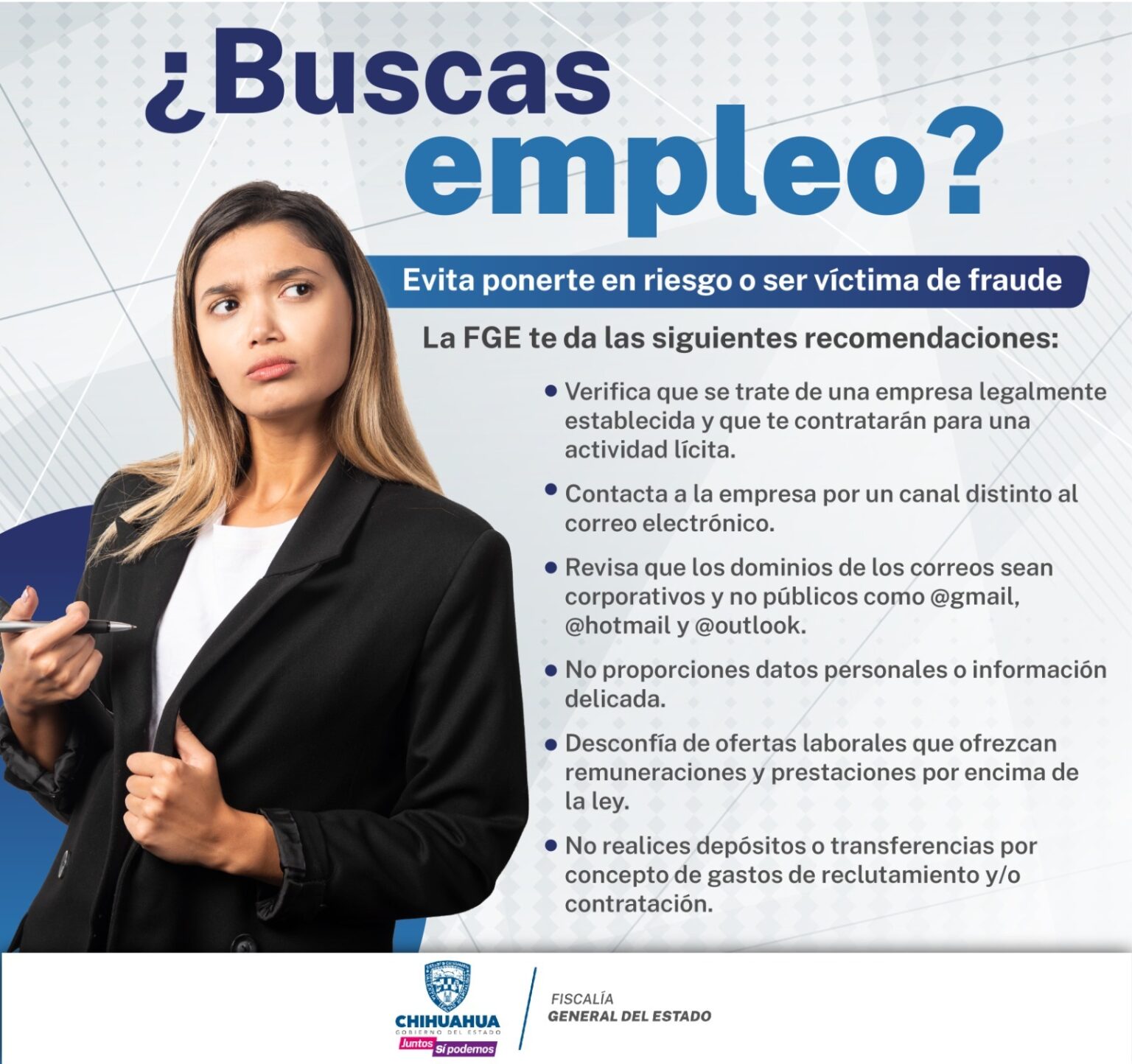 Con el objetivo de evitar que las personas que se encuentran buscando empleo se expongan a ser víctimas de un fraude o de otros delitos, la Fiscalía de Distrito Zona Sur emite las siguientes recomendaciones: