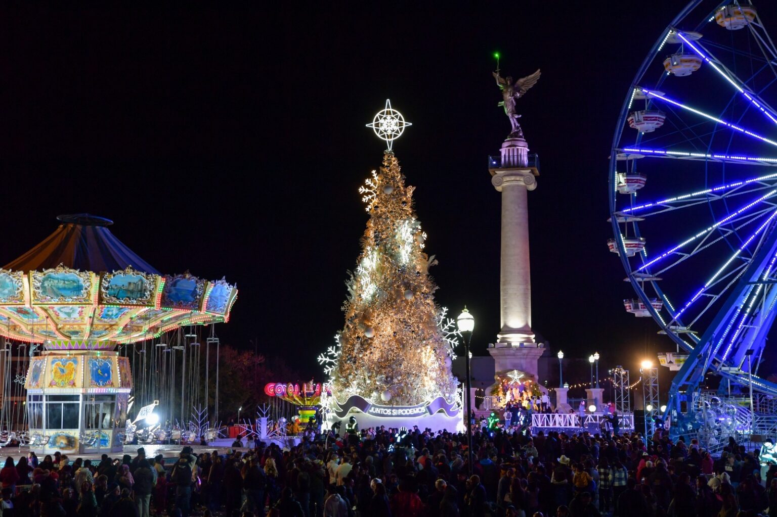 Al encabezar la ceremonia del tradicional encendido del Árbol de Navidad en la Plaza del Ángel, la gobernadora Maru Campos dijo a los chihuahuenses: “Encendamos una luz en nuestros corazones con las victorias que conquistamos este año”.