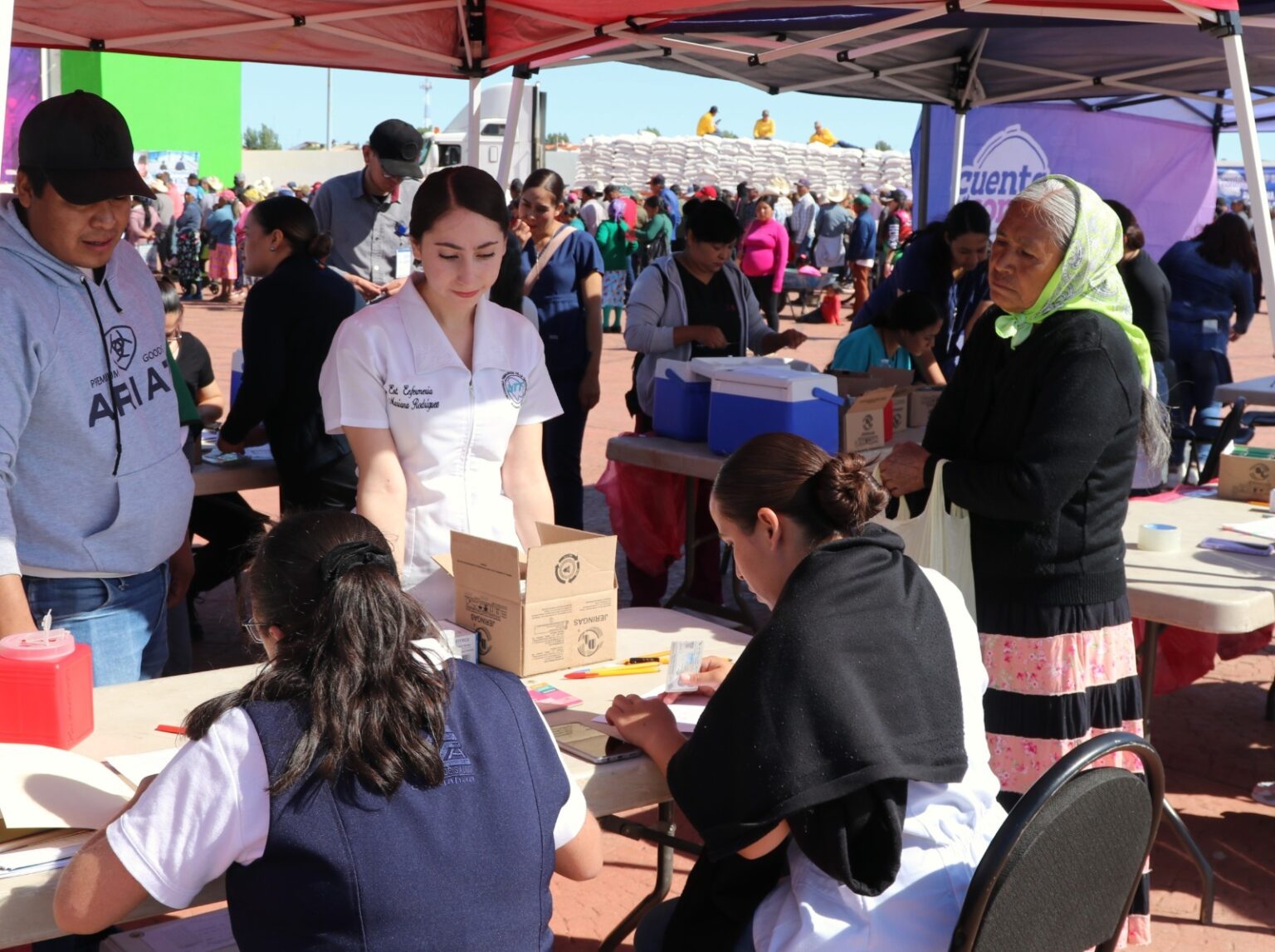 Personal del DIF Estatal, y de la Secretaría de Pueblos y Comunidades Indígenas (SPyCI) entregó en Guachochi y Carichí apoyos alimentarios del programa NutriChihuahua, durante el desarrollo de las jornadas de vacunación contra el sarampión.