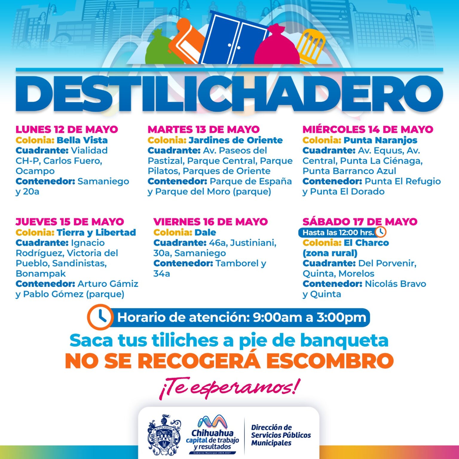 Para evitar acumulaciones de basura de grandes dimensiones en las viviendas, que podría generar plagas o problemas de salud, el Gobierno Municipal, a través de la Dirección de Servicios Públicos Municipales, informa el calendario del programa Destilichadero, que se realizará del 12 al 17 de mayo en seis colonias de la Capital.