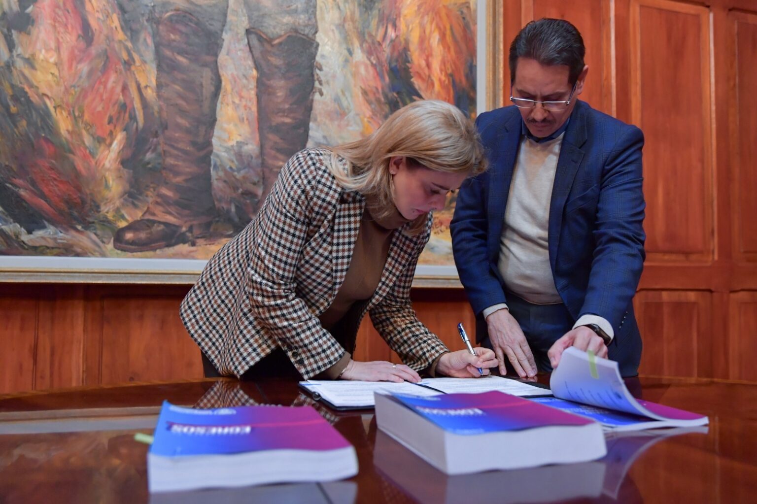 La titular del Ejecutivo estuvo acompañada por el secretario de Hacienda, José de Jesús Granillo, el secretario General de Gobierno, Santiago de la Peña y la subsecretaria de Egresos, Verónica García, quienes también plasmaron su rúbrica en el documento.