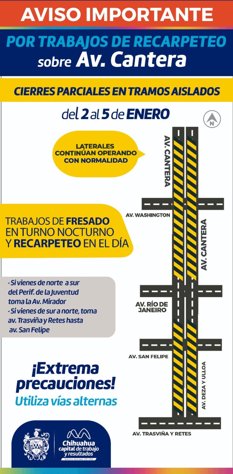 La Dirección de Obras Públicas, recuerda que hoy 02 de enero, iniciarán por la noche los trabajos de fresado en avenida de La Cantera, por lo que invita a tomar precauciones al circular por las zonas de trabajo.