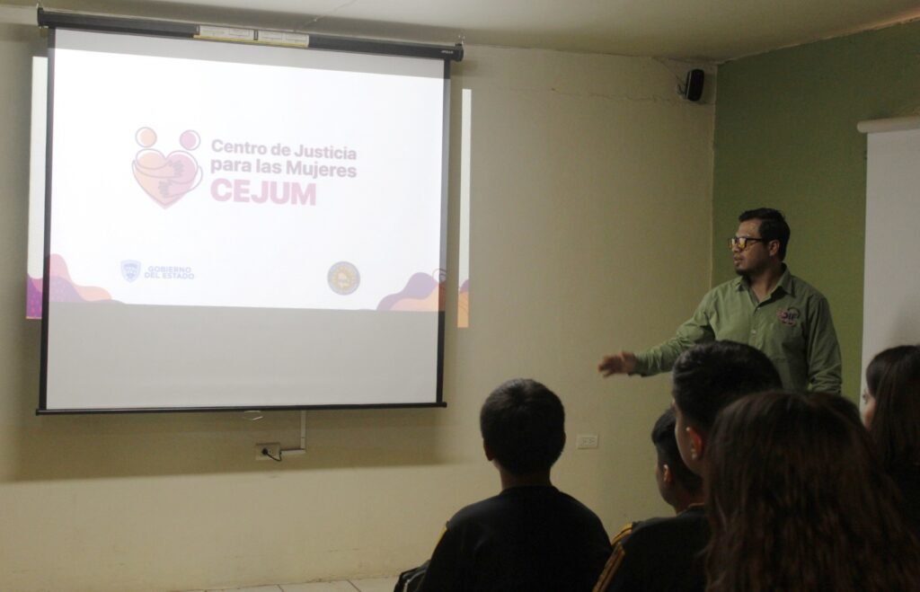 El Centro de Justicia para las Mujeres (CEJUM), “Paloma Angélica Escobar Ledezma”, impartió una plática sobre violencia en el noviazgo en las instalaciones de la Preparatoria por Cooperación “Maestros Mexicanos 8418, Plantel I”.