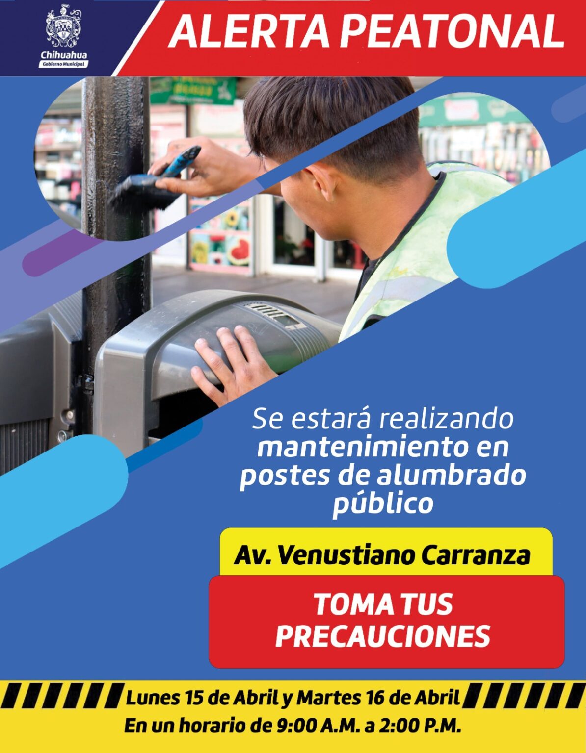 Chihuahua, Chih.- El Gobierno Municipal de Chihuahua, a través de la Dirección de Mantenimiento Urbano, informa a la ciudadanía que se estarán realizando trabajos de mejora en postes de alumbrado público ubicados en la avenida Venustiano Carranza, en el tramo comprendido entre la calle Escorza y la 20 de Noviembre.