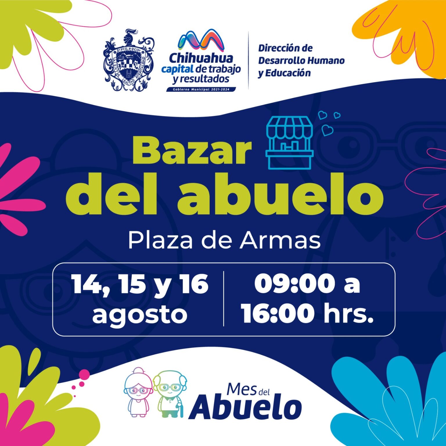 En el marco del Día del Abuelo que se celebra el 28 de agosto, el Gobierno Municipal, a través de la Dirección de Desarrollo Humano y Educación, invita a los habitantes de Chihuahua Capital al “Bazar del Abuelo”.