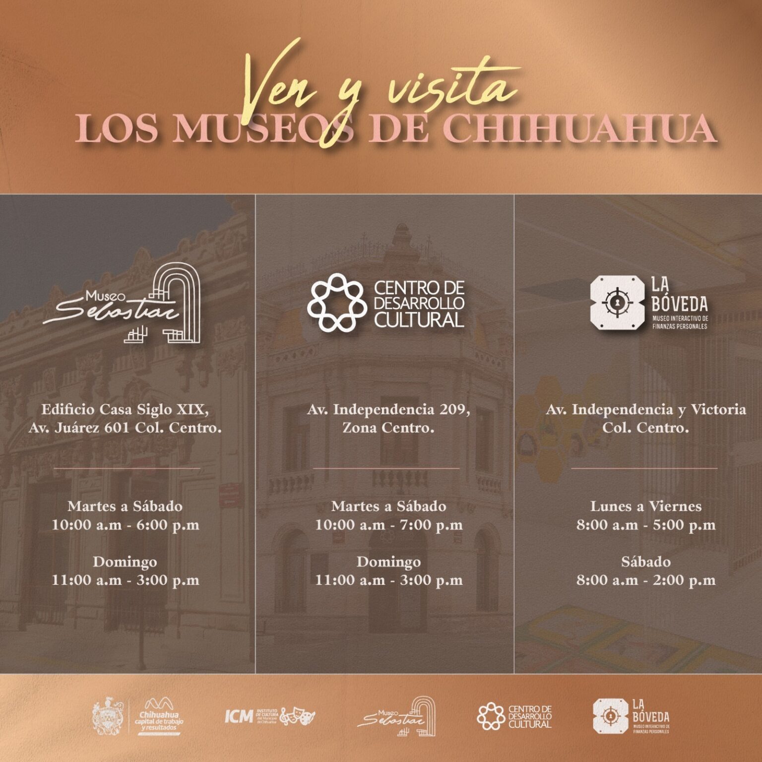 El Gobierno Municipal, a través del Instituto de Cultura del Municipio, invita a la ciudadanía a visitar los museos Museo Sebastian Casa Siglo XIX, Centro de Desarrollo Cultural y la Bóveda, todos ubicados en el Centro de la ciudad de Chihuahua.