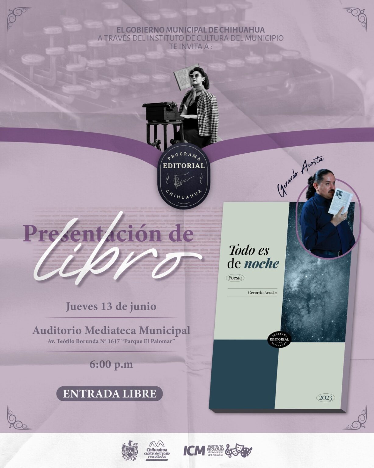 El Gobierno Municipal de Chihuahua, a través del Instituto de Cultura del Municipio, invitó a toda la comunidad a la presentación del libro “Todo es de noche”, del autor Gerardo Acosta, este jueves 13 de junio a las 6:00 pm en el auditorio de la Mediateca Municipal, ubicada en Av. Teófilo Borunda #1617 «Parque El Palomar».