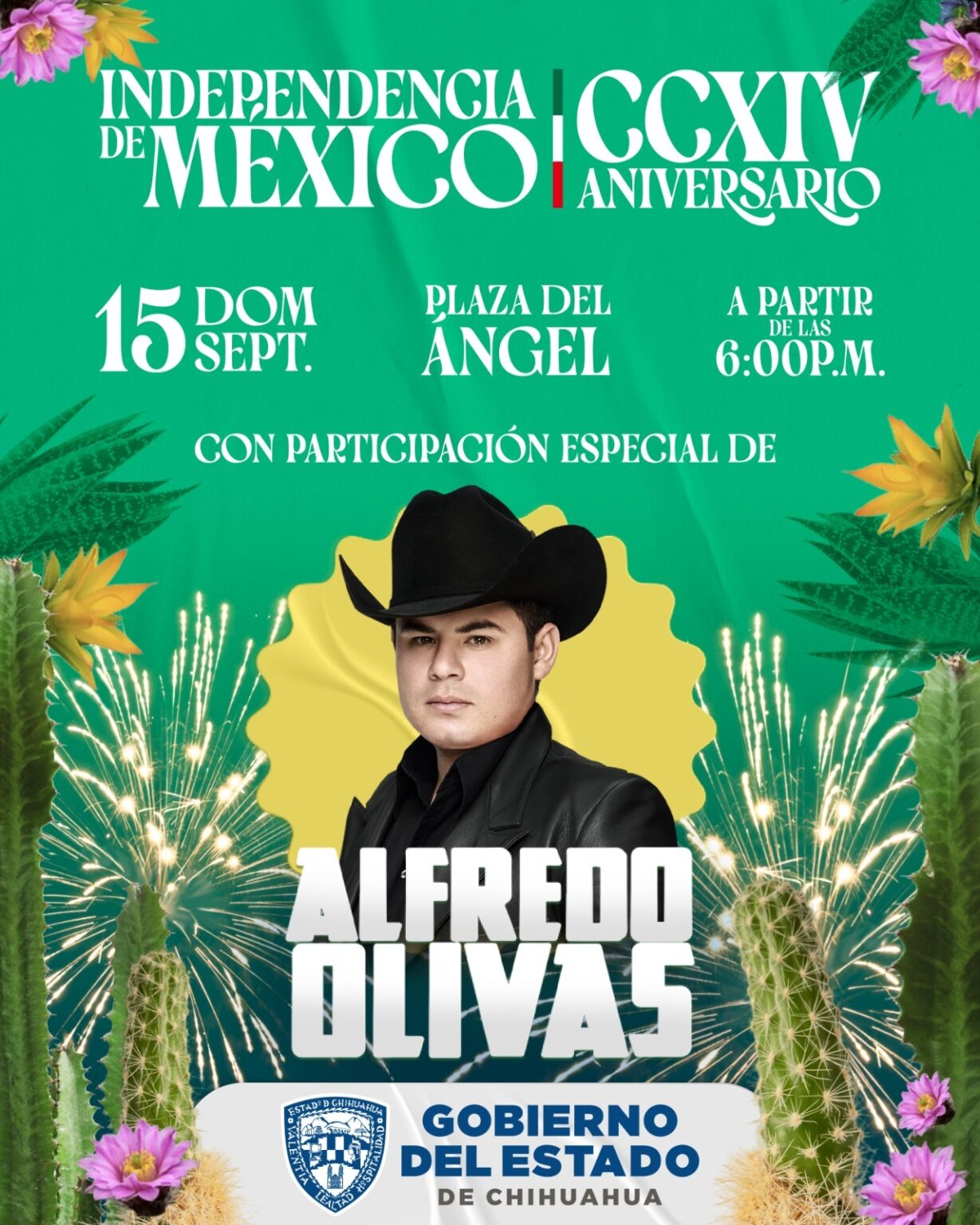 En el marco de la celebración del 214 aniversario del Grito de Independencia, el Gobierno del Estado invita a las y los chihuahuenses a participar en la gran fiesta que se llevará a cabo en la Plaza del Ángel a cargo de artistas locales y nacionales, junto con un mega show de pirotecnia.
