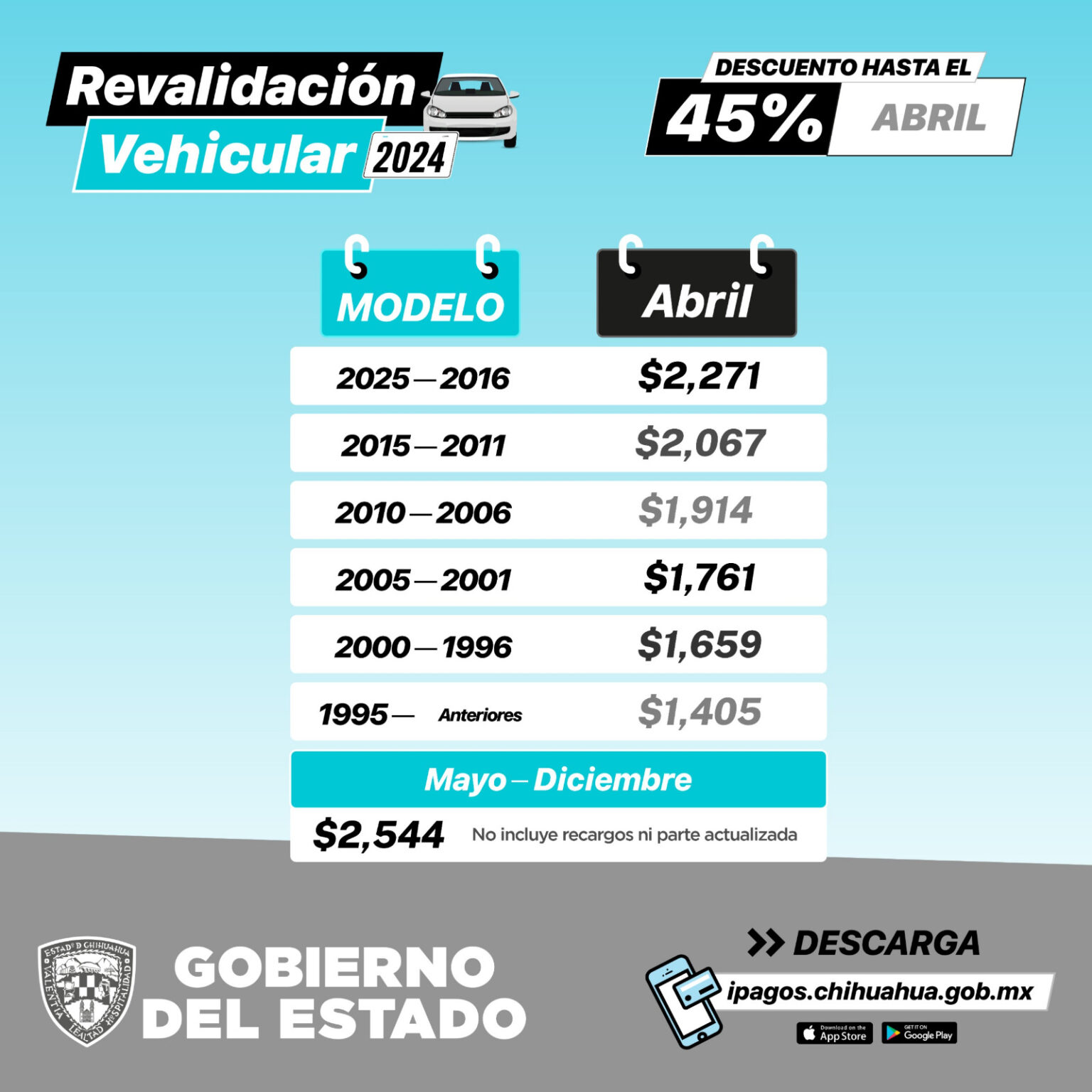 Los costos durante el mes de abril para modelos muy recientes del 2016 al 2025 es de 2 mil 271; para modelos del 2011 al 2015 es de 2 mil 67; 2006 al 2010 es de mil 914; del 2001 al 2005 es de mil 761; de 1996 al 2000 es de mil 659 y de modelos anteriores a 1995 es de mil 405 pesos.