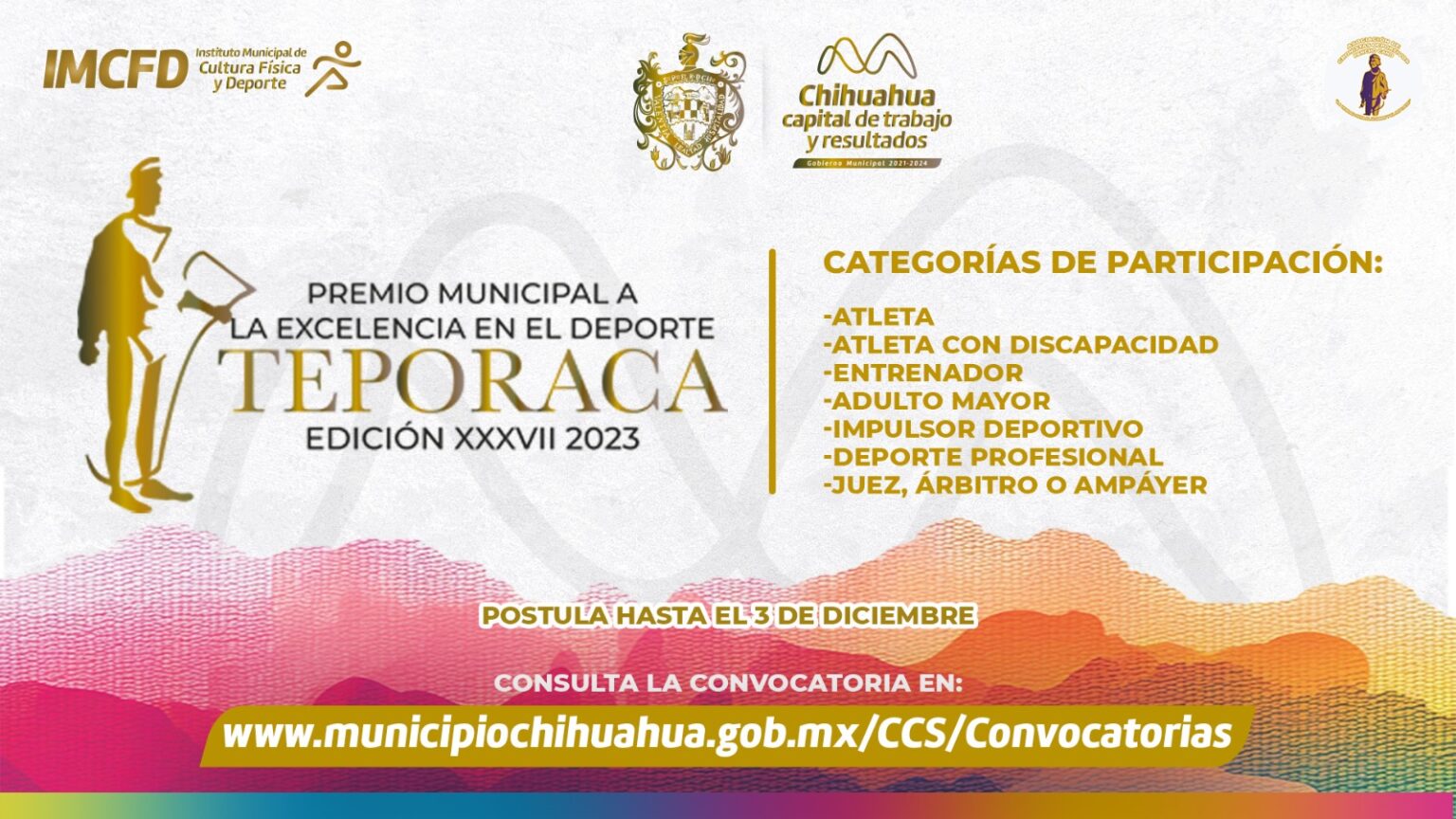 El Premio Municipal a la Excelencia en el Deporte “Teporaca”, que inició la asociación de Cronistas Deportivos “Pancho Cano”, es entregado en conjunto con el Ayuntamiento de Chihuahua en una sesión solemne de Cabildo que se tiene prevé celebrar el próximo jueves 25 de enero 2024 en el Teatro de la Ciudad y, con un festejo público a través de un desfile de ganadores por las calles del Centro el sábado 27 de enero del próximo año.