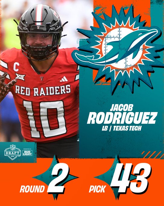 El linebacker Jacob Rodríguez, de raíces mexicanas, cumplió el sueño de llegar a la NFL al ser seleccionado por los Dolphins de Miami con el pick número 43 global, en la segunda ronda del Draft 2026. Proveniente de Texas Tech, Rodríguez llega como una de las joyas defensivas de su generación para reforzar el segundo nivel de la franquicia, buscando darle más agresividad y profundidad al equipo.