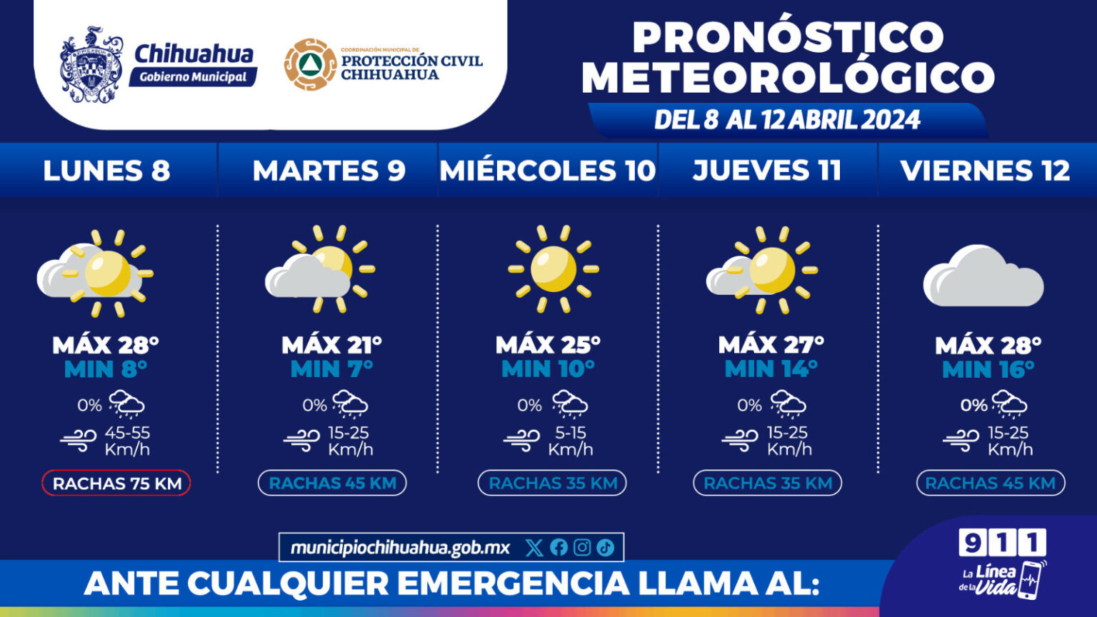 Chihuahua, Chih. A 08 de abril del 2024.- La Coordinación Municipal de Protección Civil informa a la ciudadanía que, para esta semana en la Capital se pronostican temperaturas máximas de 28 °C, por lo exhortan a la población a tomar precauciones por calor.
