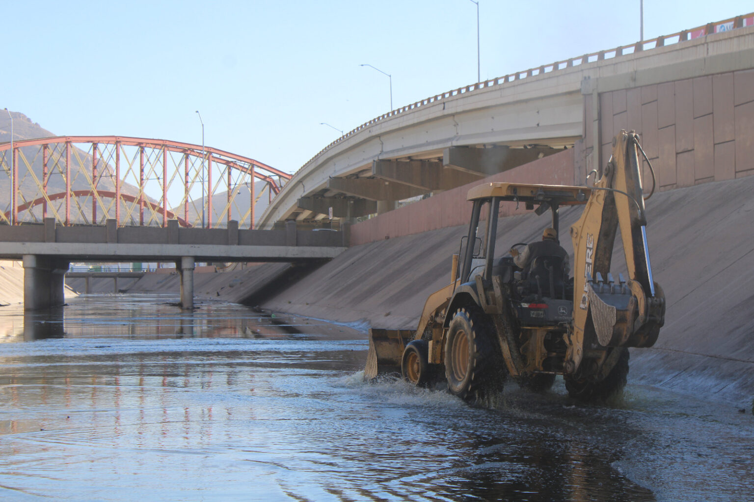 Con maquinaria pesada, se trabaja en la limpieza de la parte canalizada del río Chuviscar, con el raspado de la superficie para evitar la acumulación de lama y basura.