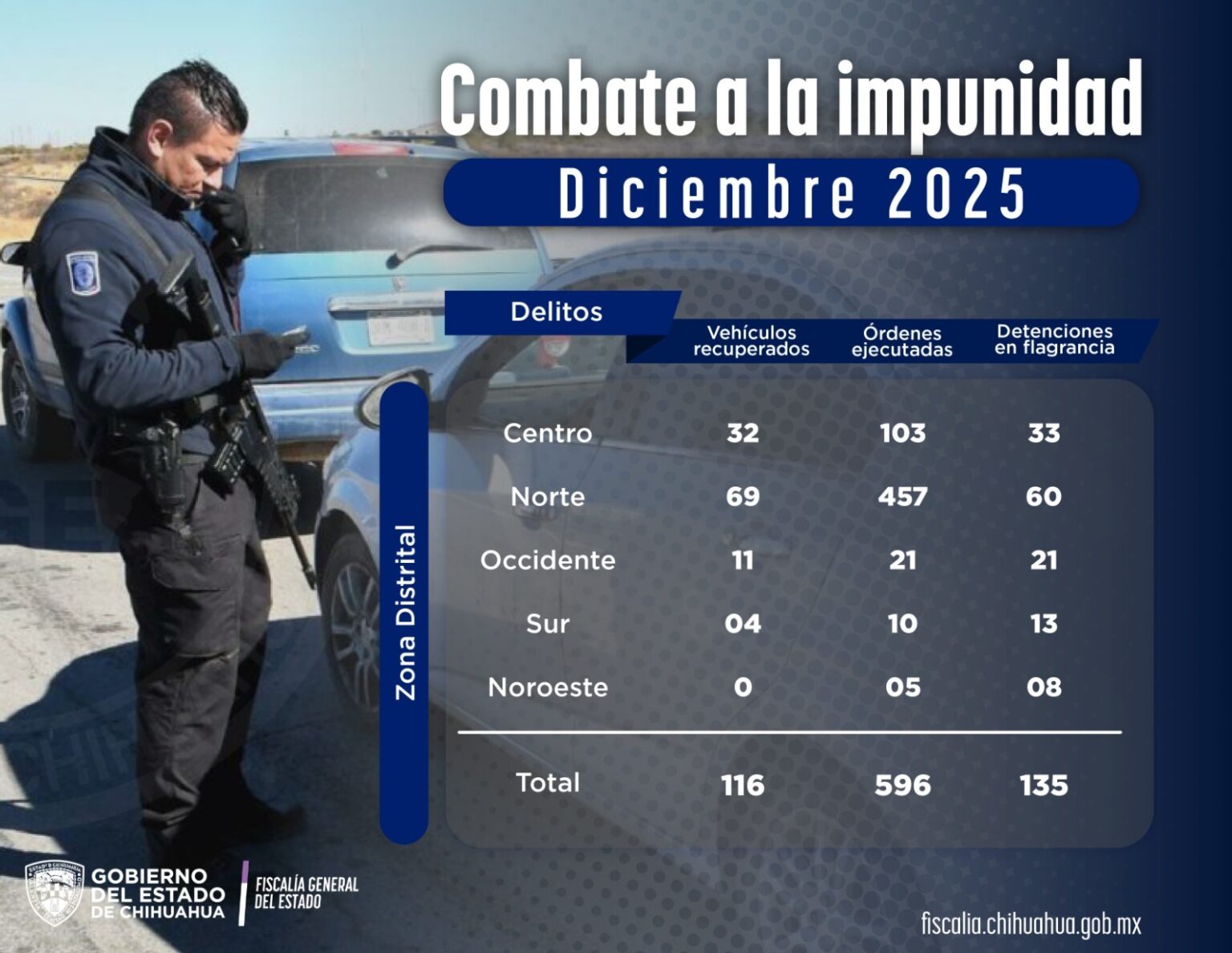 Lo anterior, de acuerdo con el informe de incidencias diarias de la Dirección de Estadística Criminal, de la Agencia Estatal de Investigación y de las Fiscalías de Distrito: la Norte, con sede en Ciudad Juárez; Centro, con sede en la ciudad de Chihuahua; Occidente, con sede en la ciudad de Cuauhtémoc; Noroeste, con sede en Nuevo Casas Grandes y Sur, con sede en la ciudad de Parral.