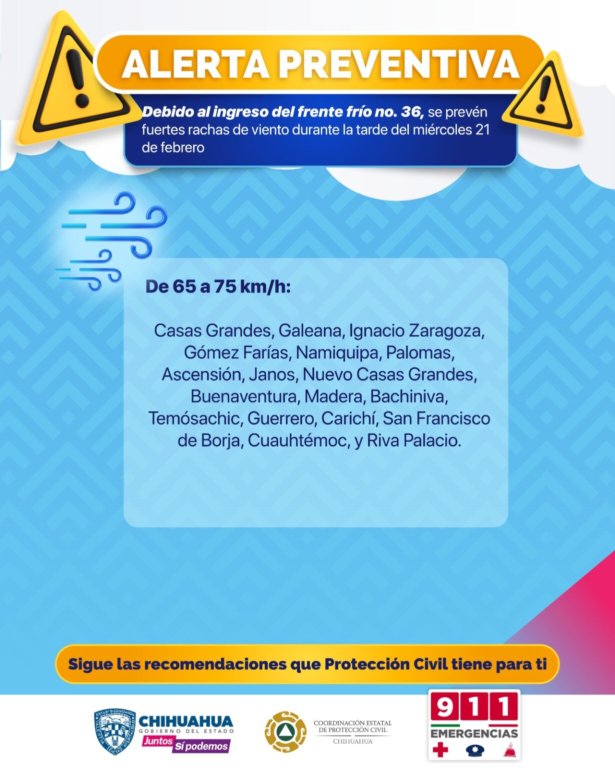 Las ráfagas podrían alcanzar los 65 y 75 kilómetros por hora (km/h) en Casas Grandes, Galeana, Ignacio Zaragoza, Gómez Farías, Namiquipa, Palomas, Ascensión, Janos, Nuevo Casas Grandes, Buenaventura, Madera, Bachíniva, Temósachic, Guerrero, Carichí, San Francisco de Borja, Cuauhtémoc y Riva Palacio.