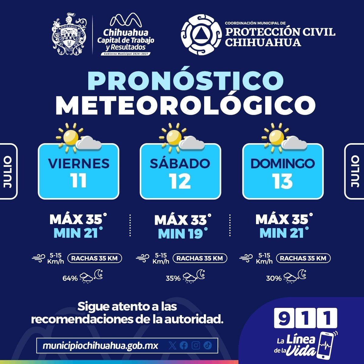 La Coordinación Municipal de Protección Civil informa que, para este fin de semana del 11 al 13 de julio, la temperatura máxima será de 35°C y la mínima rondará los 19°C.