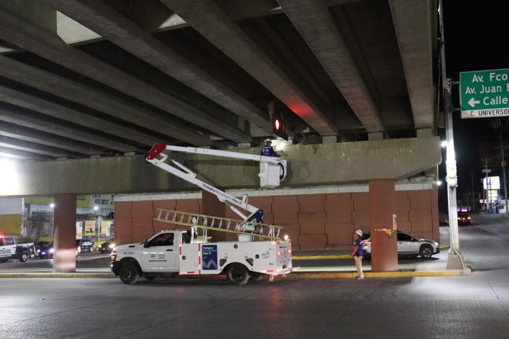Como parte de estas acciones, y en beneficio de miles de personas que diariamente transitan por vialidades como el Periférico de la Juventud y la avenida Tecnológico, la Dirección de Mantenimiento Urbano realizó la modernización a tecnología LED en cinco bajo puentes, fortaleciendo la visibilidad y la seguridad tanto para automovilistas como para peatones.