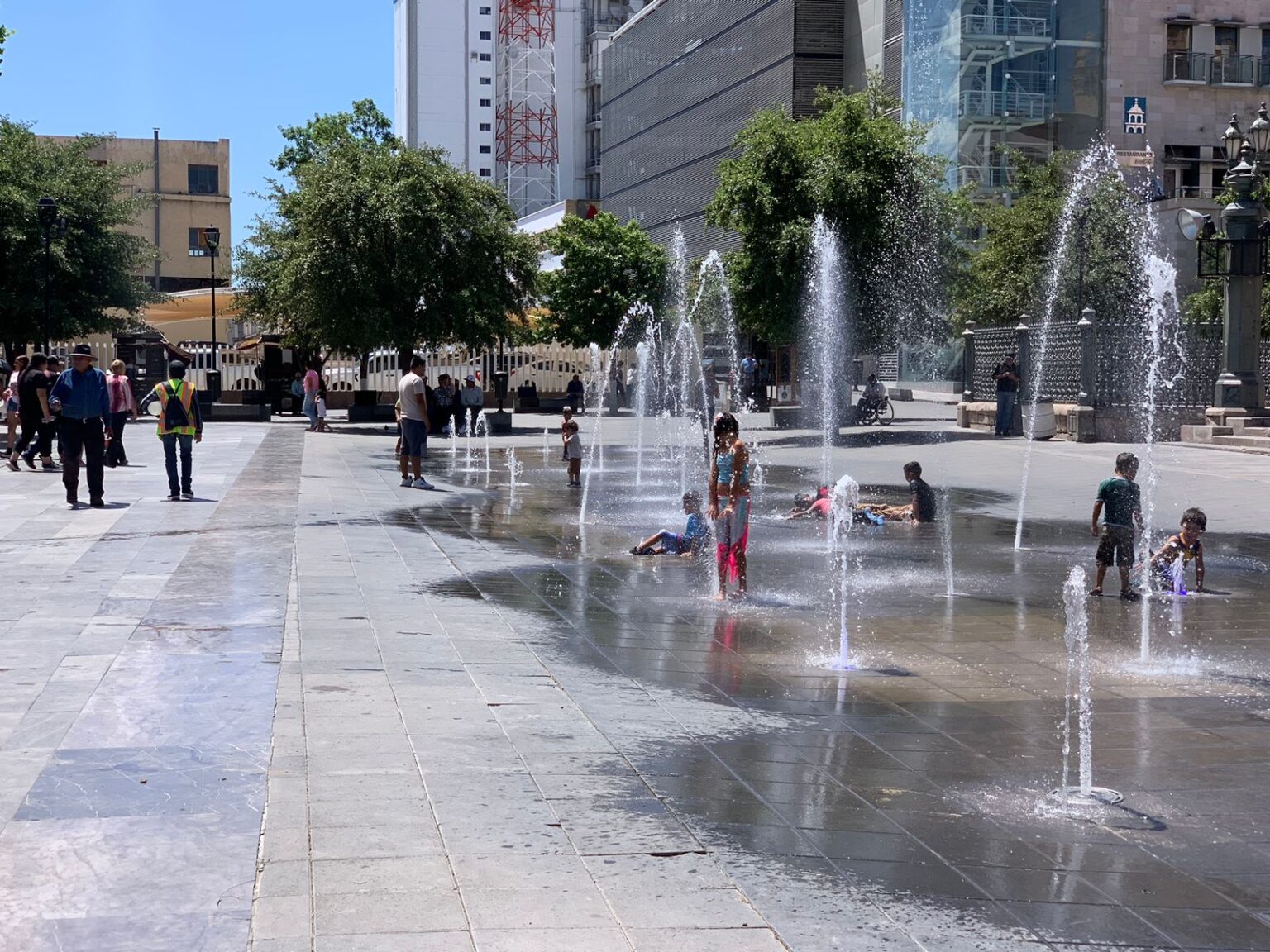 Una gran cantidad de personas se observan hoy en día visitando el Centro de la ciudad de Chihuahua durante las presentes vacaciones. Padres de familia, acompañados de sus pequeños, acuden a la Plaza de Armas para disfrutar de un tiempo libre, y los menores gustan de disfrutar de las fuentes que se encuentran frente a Catedral, mojándose para refrescarse, y es que el tiempo no está para menos, pues las altas temperaturas han originado que las personas busquen la manera de mitigar el calor de una u otra manera, y estos pequeños no dudan en colocarse junto a estas fuentes para ser tocados por el agua y como ya es costumbre, divertirse y aprovechar de sus vacaciones.