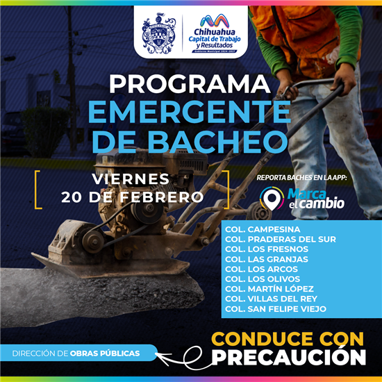 El Gobierno Municipal, a través de la Dirección de Obras Públicas, realizará trabajos de bacheo este viernes 20 de febrero mediante el programa emergente en calles de las colonias: Campesina, Praderas del Sur, Los Fresnos, Las Granjas, Los Arcos, Los Olivos, Martín López, Villas del Rey y San Felipe Viejo.