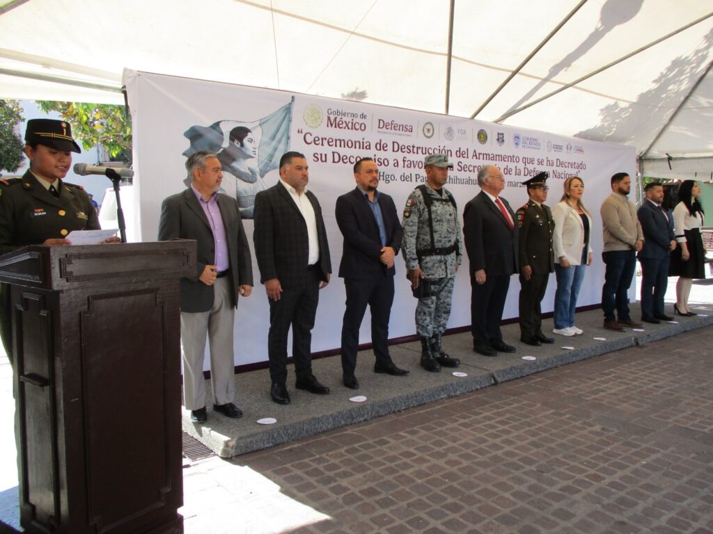 Como parte de las acciones interinstitucionales para mantener la seguridad y la paz de los Chihuahuenses, este jueves 19 de marzo la Fiscalía General del Estado y la Agencia Estatal de Investigación (AEI), participaron en la destrucción de armamento asegurado y puesto a disposición de la Secretaría de la Defensa Nacional (SEDENA), realizada en las inmediaciones de la Plaza de la Identidad, en la ciudad de Parral.