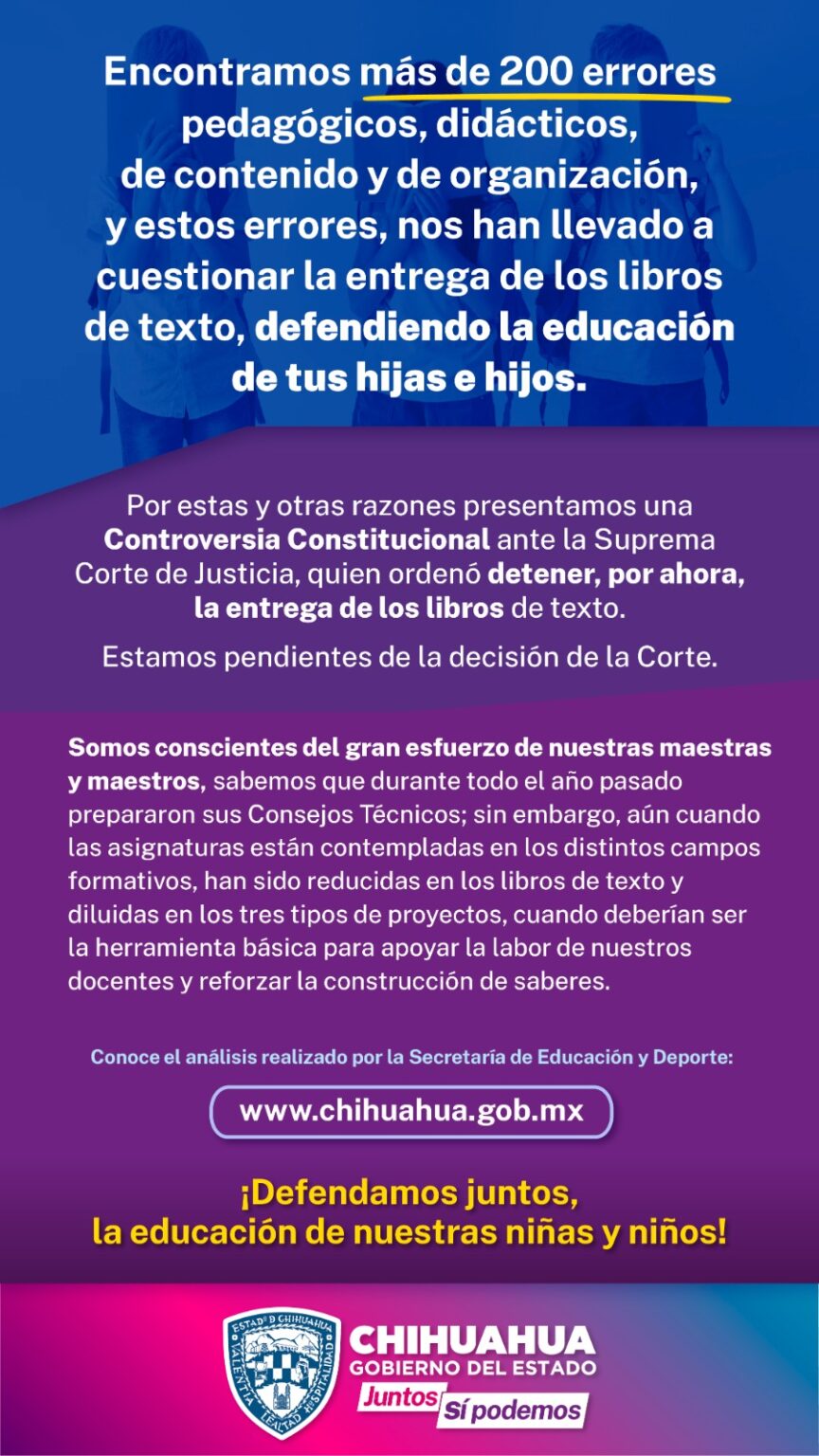 El Estado de Chihuahua informó que han sido detectados más de 200 errores pedagógicos, didácticos, de contenido y de organización, que llevaron a cuestionar su entrega, en defensa de las niñas y niños de la entidad.